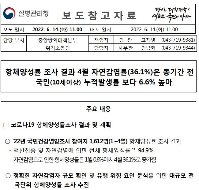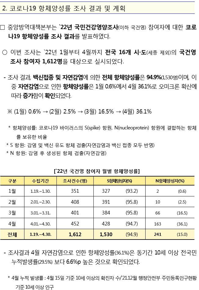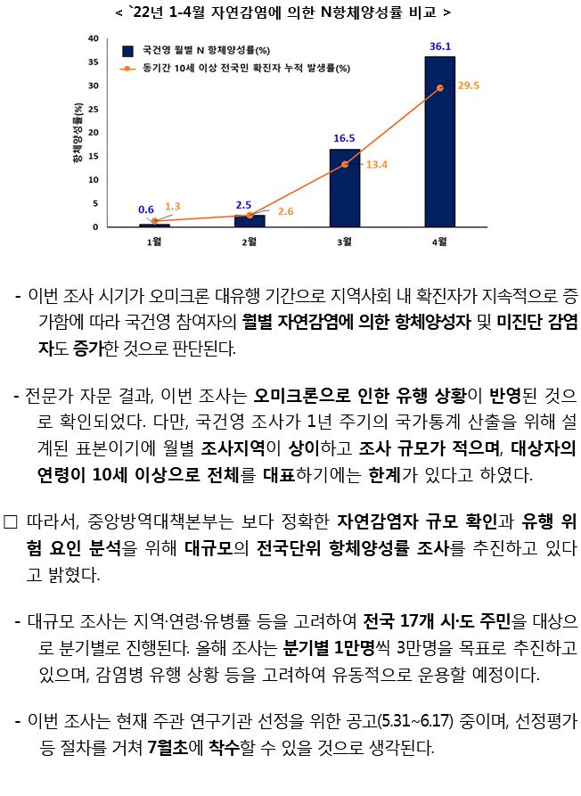 코로나19(2022.6.14) 항체양성 조사결과 및 전국단위 조사계획 본문
