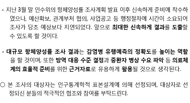 표본조사결과 백신접종 및 자연감염에 의한 전체 항체양성률은 약 95%