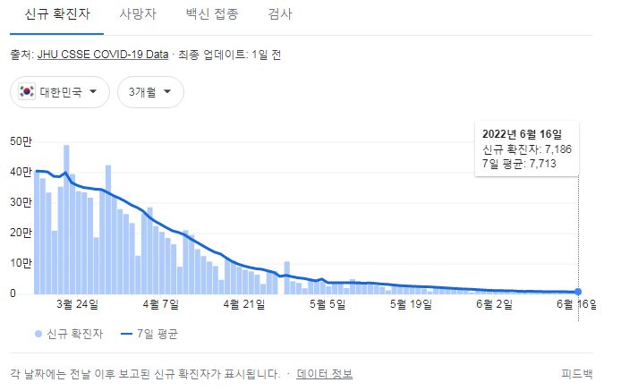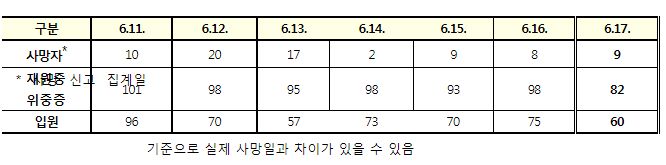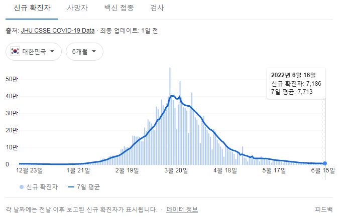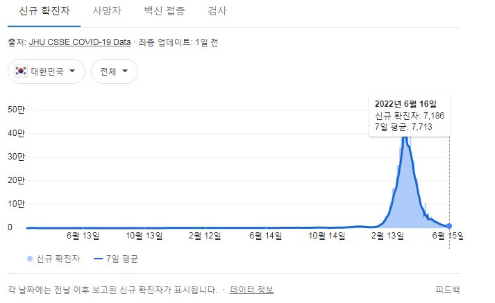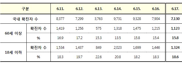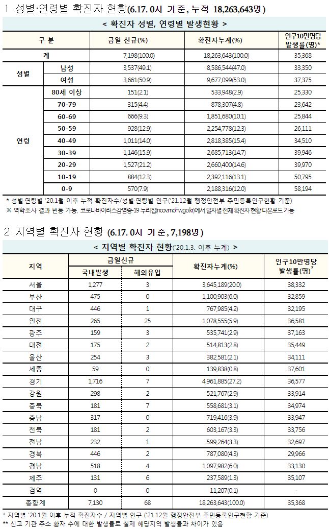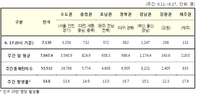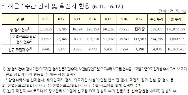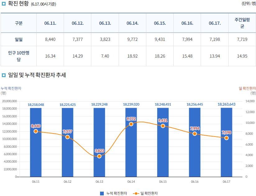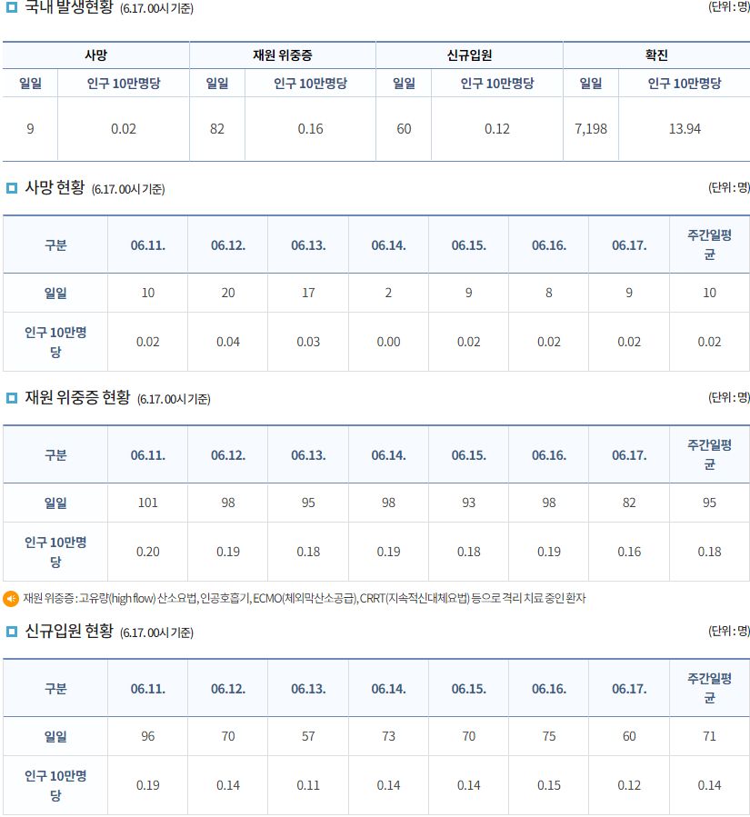 코로나19집계(2022.6.17. 0시기준): 확진자 +7198명, 사망자 +9명, 재택치료 4.4만(집중관리 2.4천) 본문