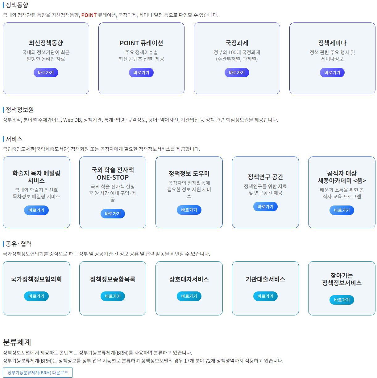 정책정보서비스 : 정부 및 공공기관, 정책결정권자, 정책연구자 등이 필요로 하는 정책정보를 편리하게 활용할 수 있도록 제공