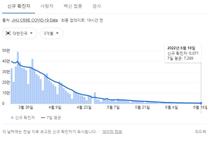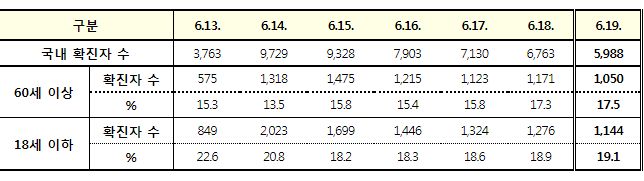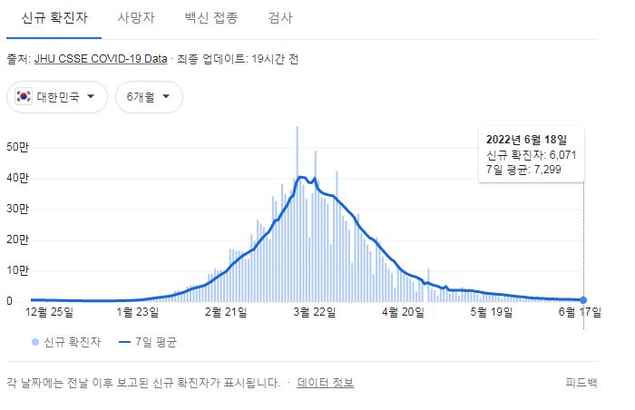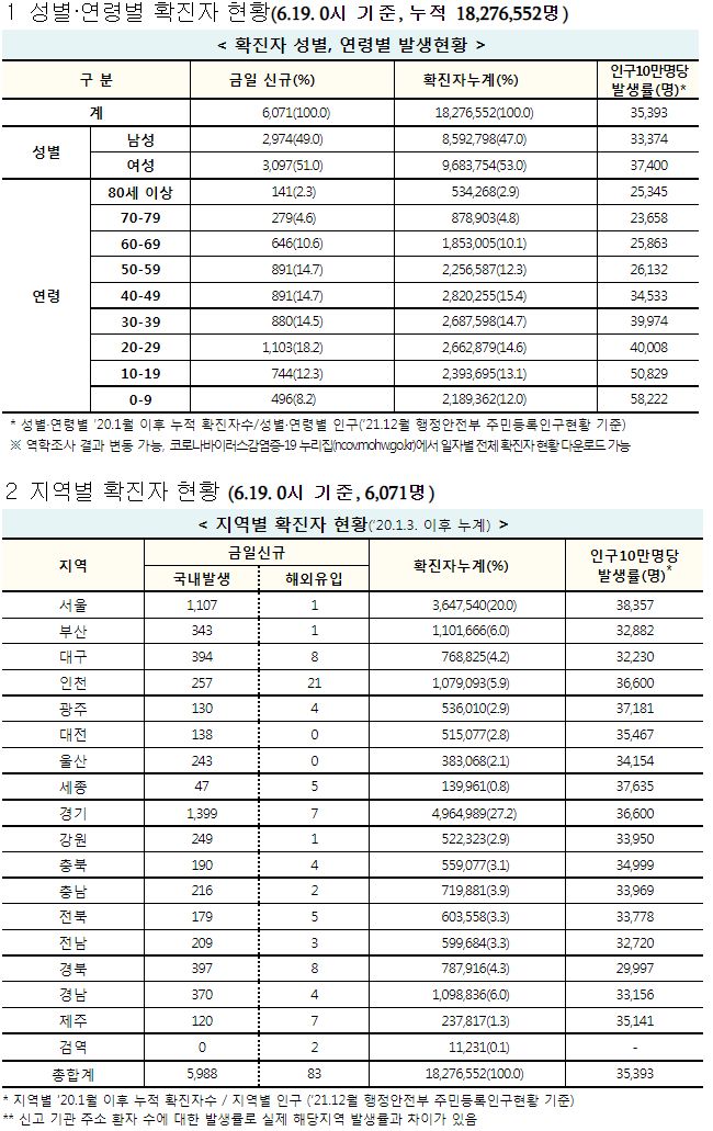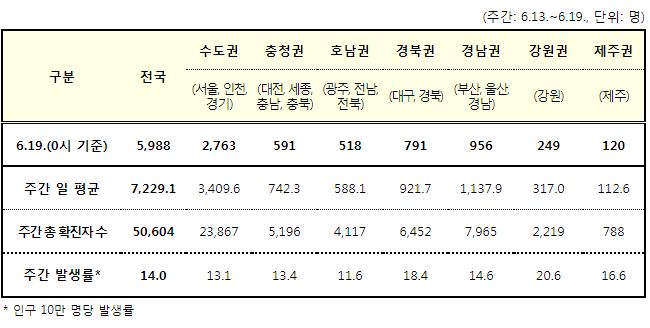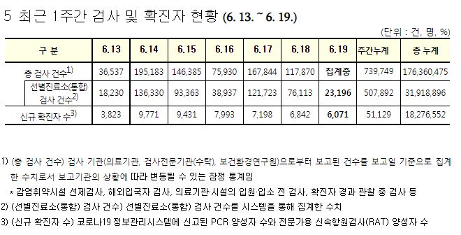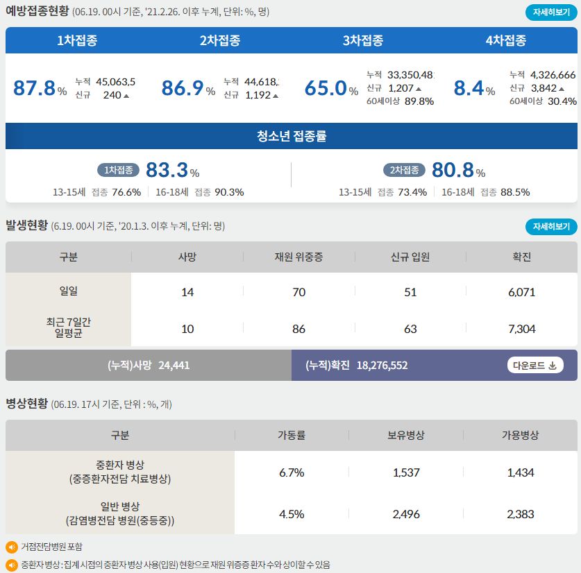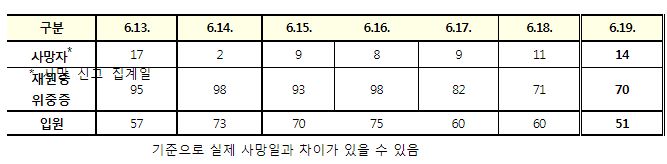 코로나19집계(2022.6.19. 0시기준): 확진 +6071명, 사망 +14명, 재택치료 4.5만(집중관리 2.4천) 본문