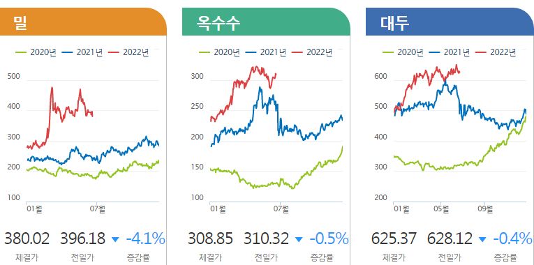 ㅡ 전쟁 중인 러시아와 우크라이나는 세계 밀공급의 1/3정도 차지. 러시아가 우크라이나산 곡물의 수출을 막아버린 관계로, 최근 서방권은 육로수출을 열기 위해 공사 중. 주전장이 평야라 생산량 감소폭도 크고 향후 전망도 불투명.