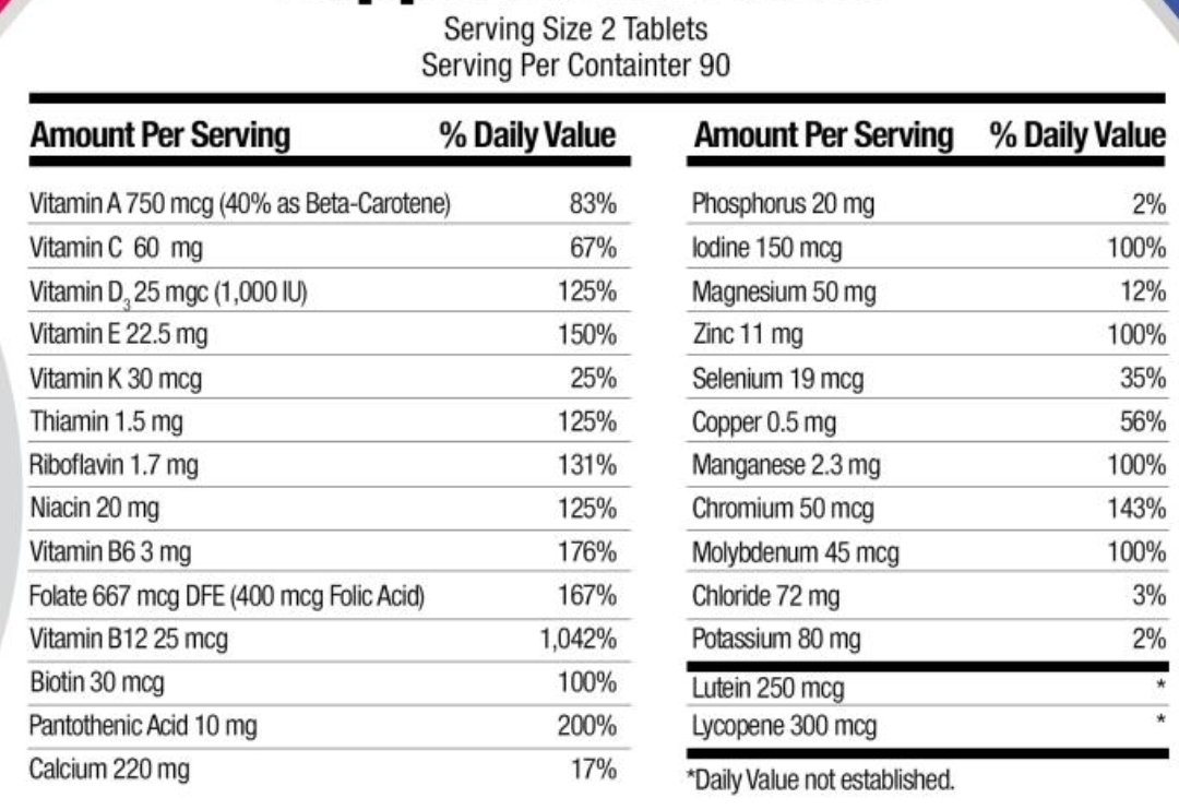 ※ 센트룸 어덜트(1알=1일분)와 센트룸 50+(미니스 2알=1일분)의 성분차이. 공식홈이 아닌, 아마존 상품설명기준.