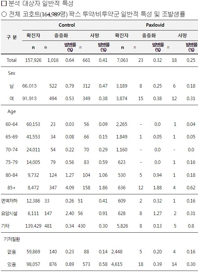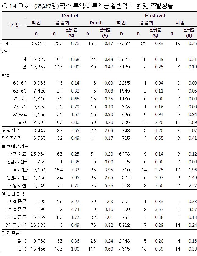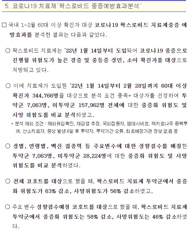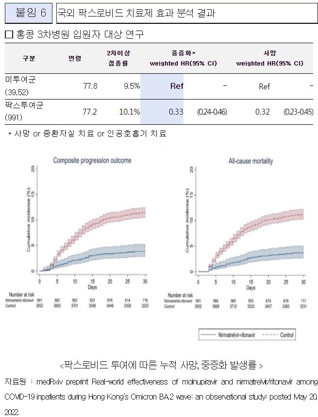 ○ 팍스로비드 투약자는 미투약자에 비해 중증화 위험도 58% 감소, 사망 위험도 46% 감소