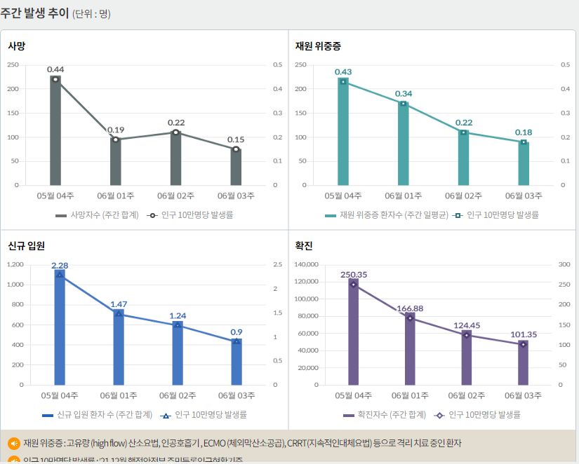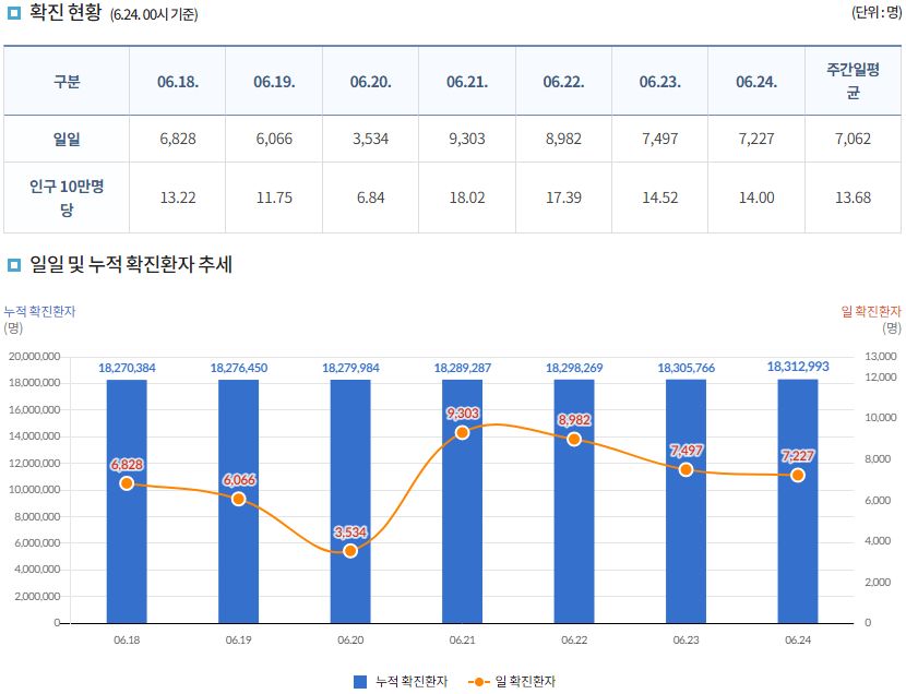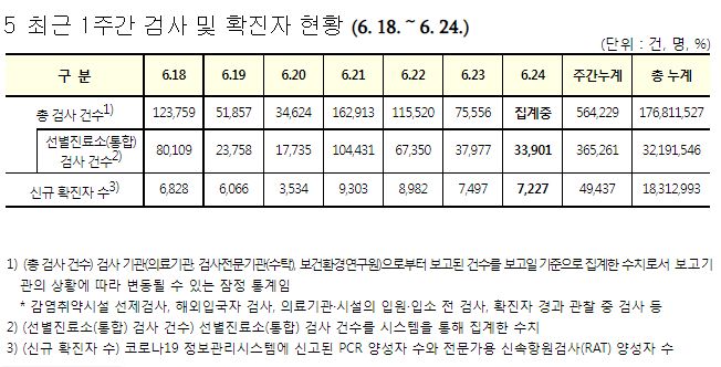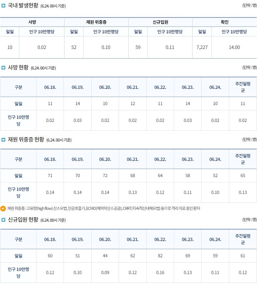 코로나19집계(2022.6.24. 0시기준): 확진: +7227명, 사망 +10명, 재택치료 4.1만(집중관리 1.9천)/:/ 먹는 치료제 재고와 사용 본문