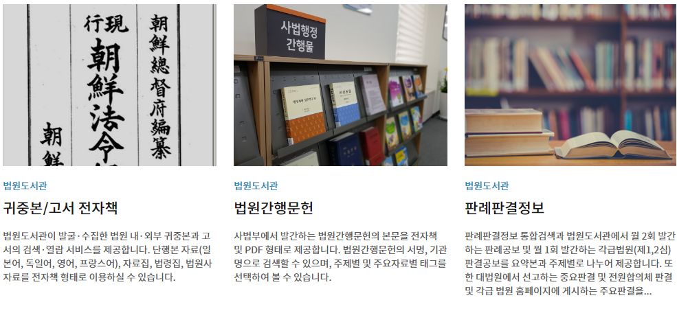 법원도서관이 발굴·수집한 법원 내·외부 귀중본과 고서의 검색·열람 서비스를 제공합니다. 단행본 자료(일본어, 독일어, 영어, 프랑스어), 자료집, 법령집, 법원사 자료를 전자책 형태로 이용하실 수 있습니다.