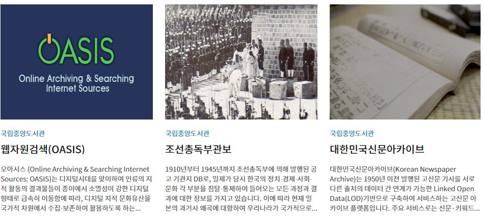 오아시스 (Online Archiving & Searching Internet Sources: OASIS)는 디지털시대를 맞이하여 인류의 지적 활동의 결과물들이 종이에서 소멸성이 강한 디지털 형태로 급속히 이동함에 따라, 디지털 지적 문화유산을 국가적 차원에서 수집‧보존하여 활용하도록 하는...