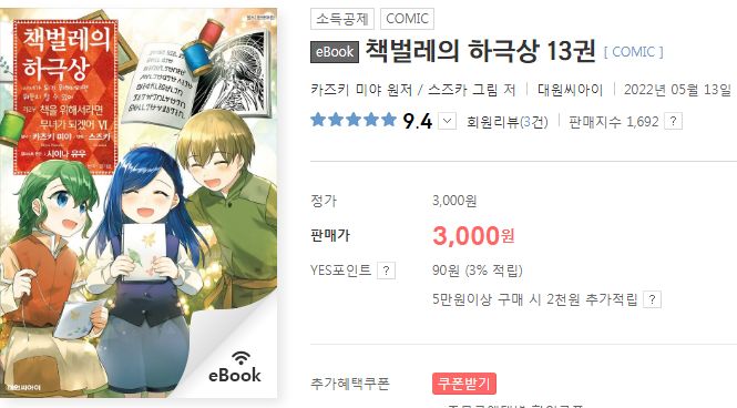 일본에서는 3, 4부도 동시에 만화화되는 모양이던데.. 우린 초판 다 팔아가면서 차근차근 해가나요? 라이트노벨이나 코믹스나 느긋하군요. 그리고 약사의 혼잣말이 그렇듯이 책벌레의 하극상도 소설판과 만화를 내는 출판사가 다른데, 발행주기가 엇갈리는 게 관심이 떨어지는 것을 막는 효과도 있는 것 같습니다. 둘 다 소설발매주기가 길다 보니..