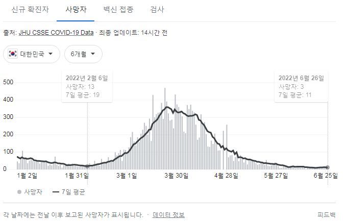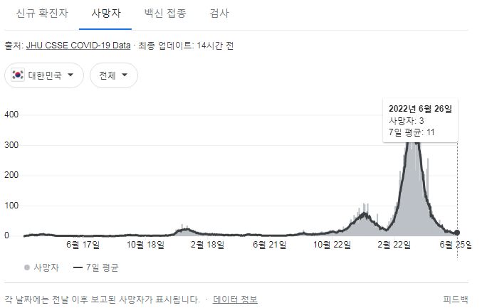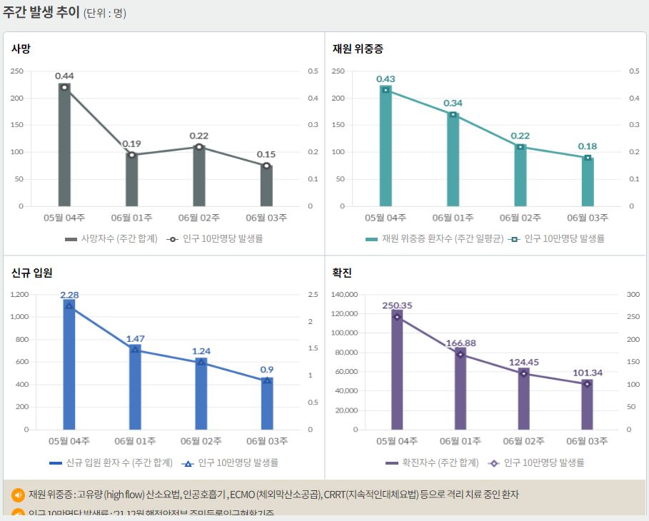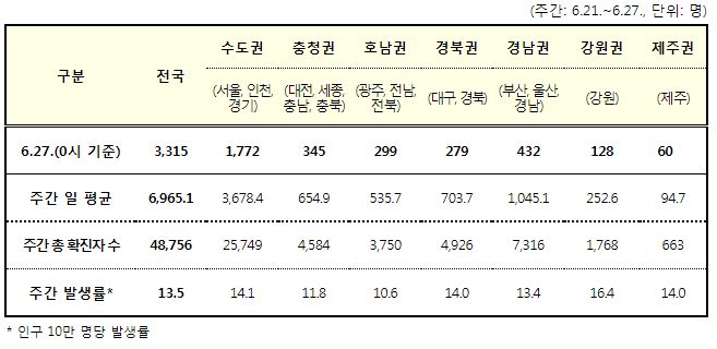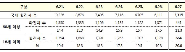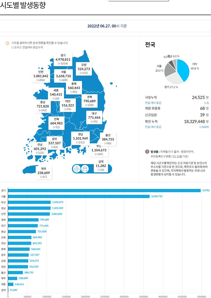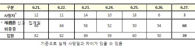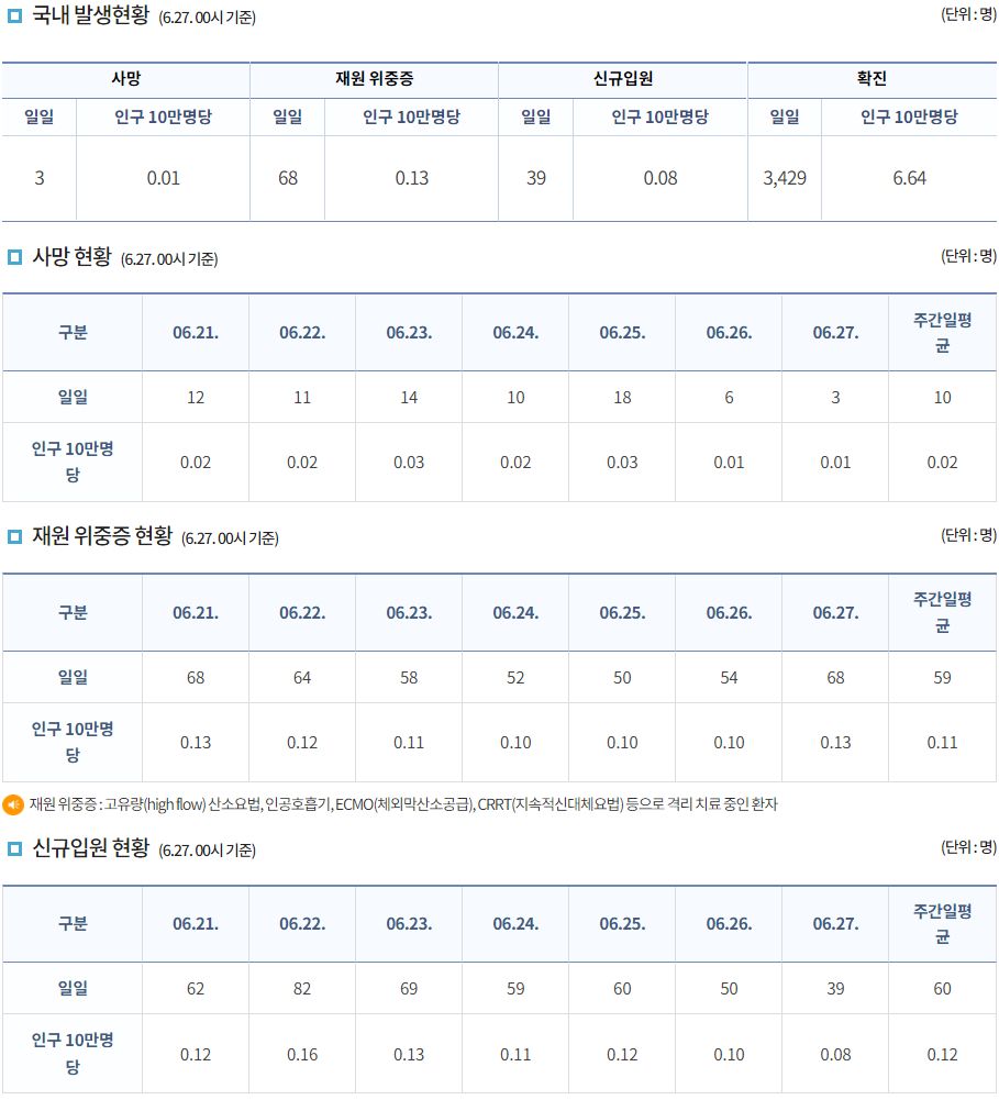 코로나19집계(2022.6.27. 0시기준): 확진 +3429명, 사망 +3명, 재택치료 4.1만(집중관리 1.9천) 본문