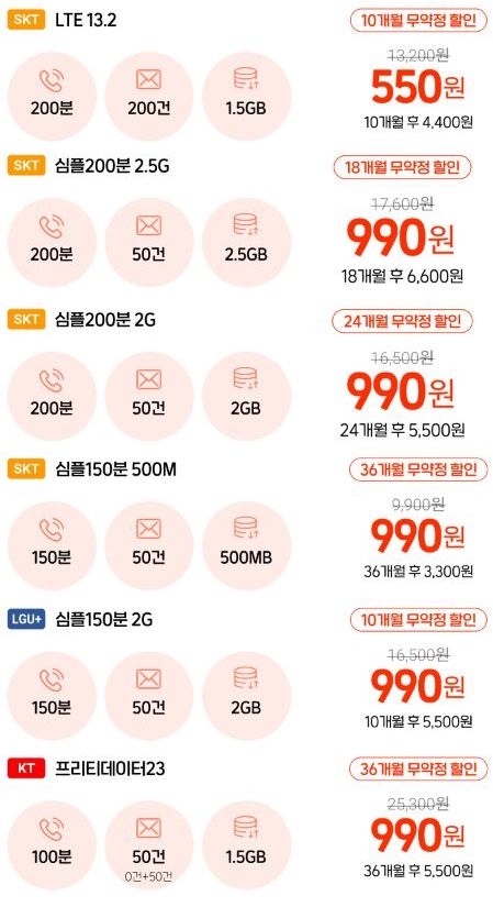 200분, 200건, 1.5GB, 10개월 550원