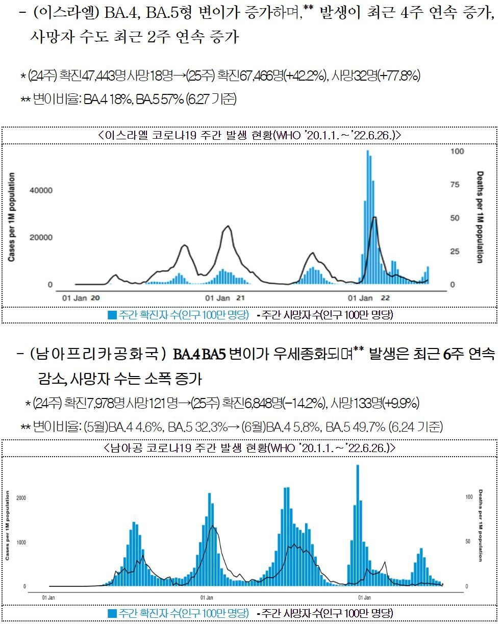 *** (이스라엘) BA.4, BA.5형 변이가 증가하며 발생이 최근 4주 연속 증가, 사망자 수도 최근 2주 연속 증가