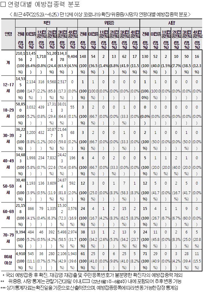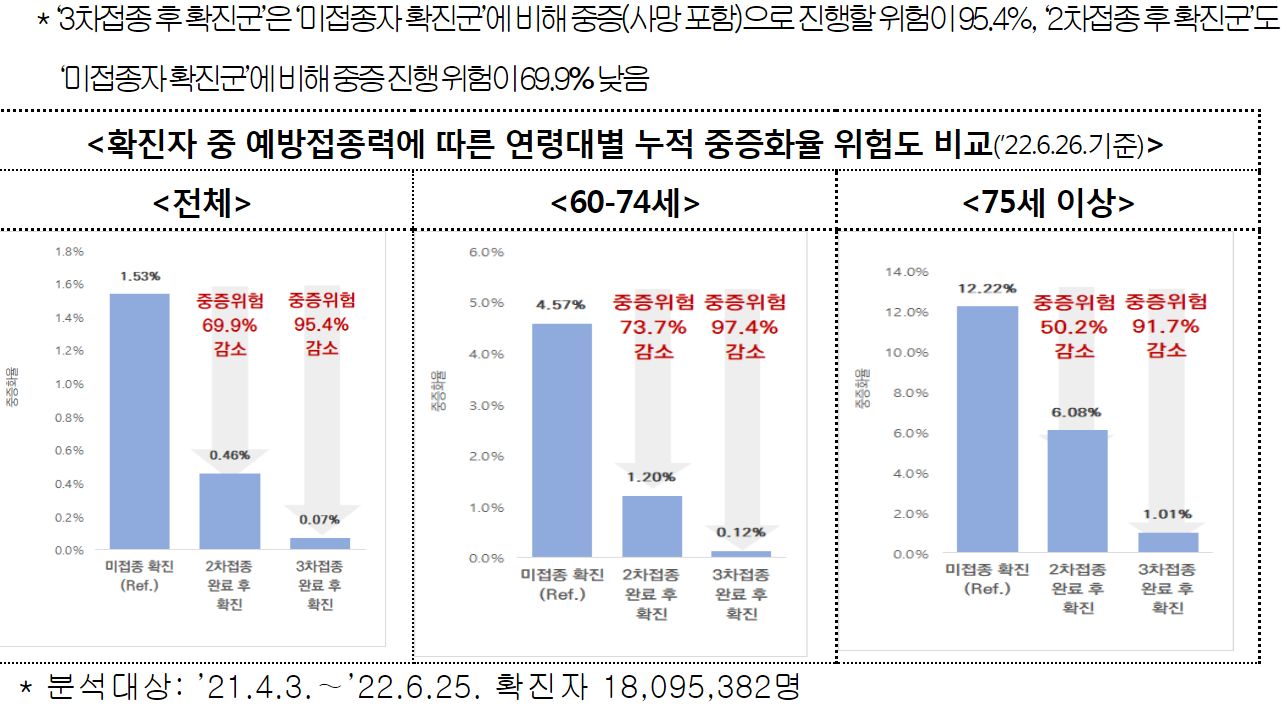 확진자, 위중증, 사망자: 위중증/사망자 모두 감소. 사망자는 미접종+기저질환+고령층. 예방접종 맞으세요