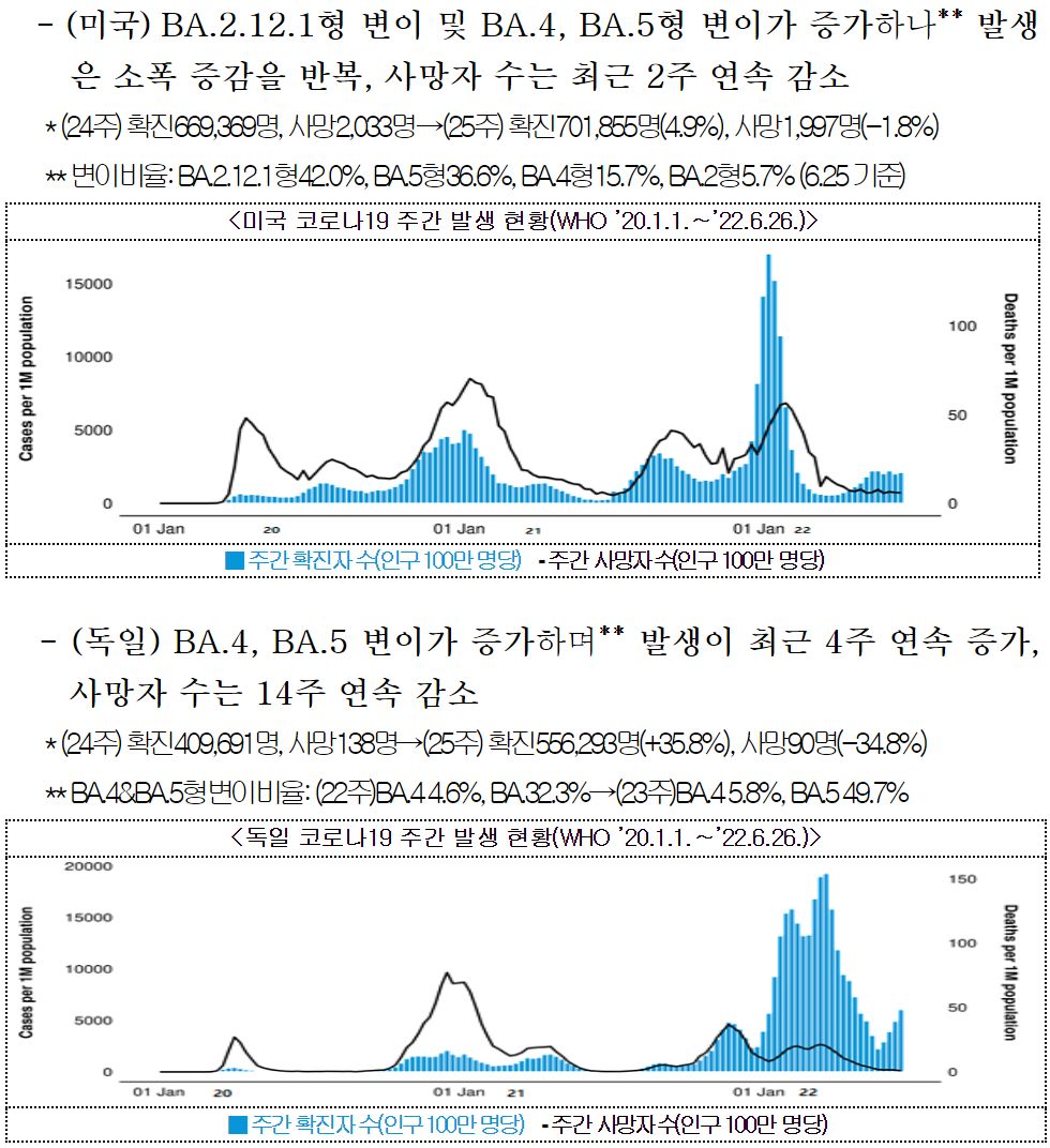 ** (독일) BA.4, BA.5형 변이가 증가하며 발생이 최근 4주 연속 증가, 사망자 수는 14주 연속 감소
