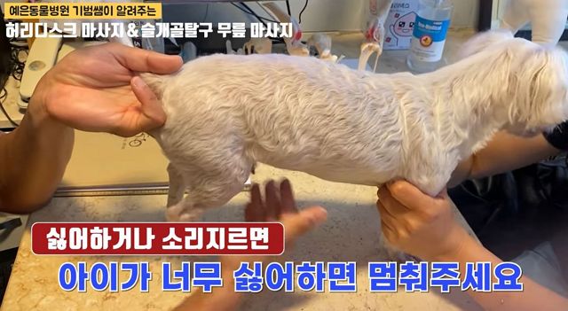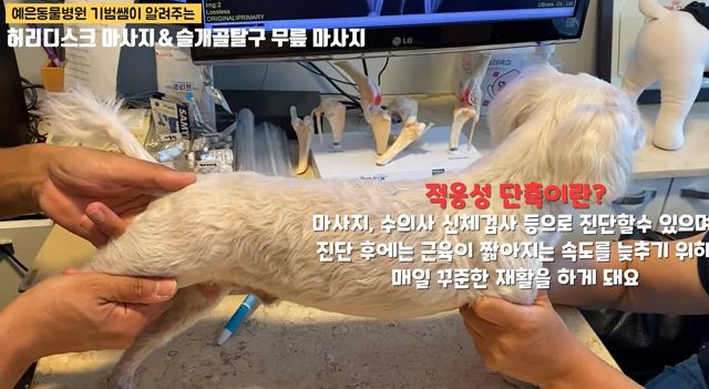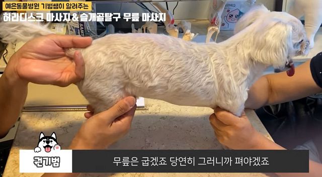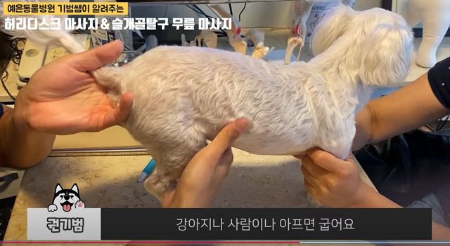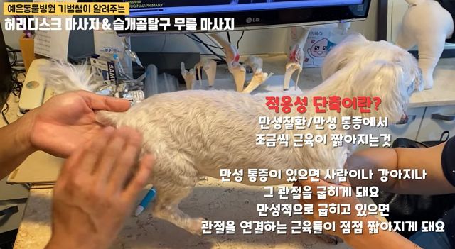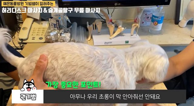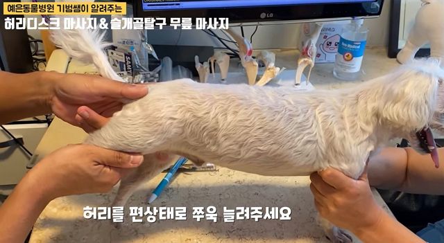 다른 진료예. 강아지 마사지. 그리고 건강한 강아지의 허리자세에 대한 설명.