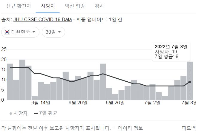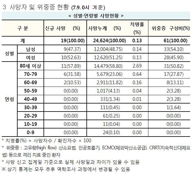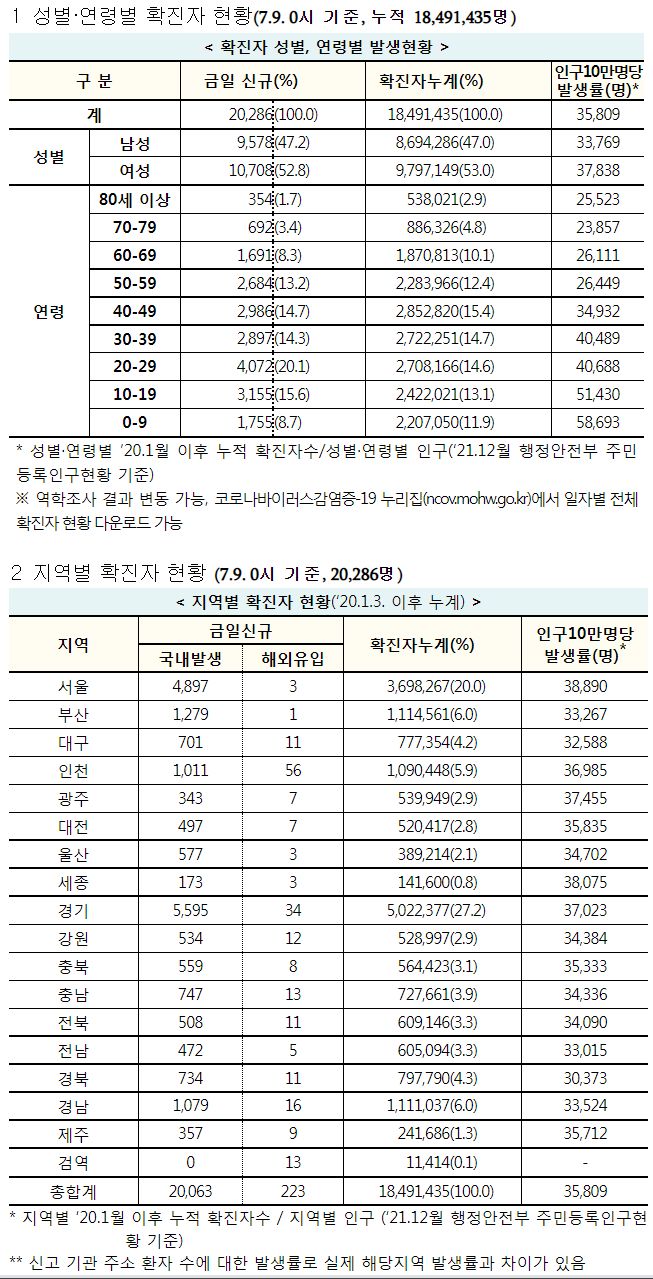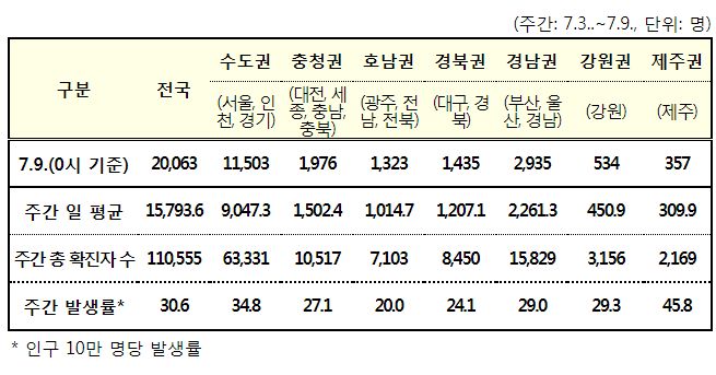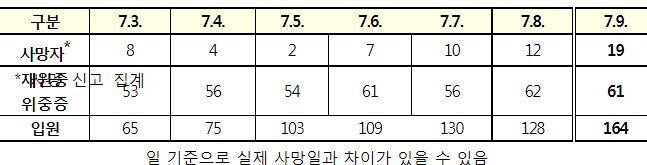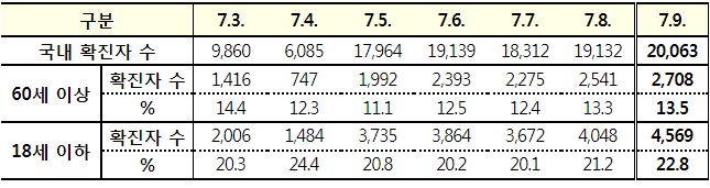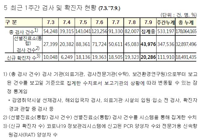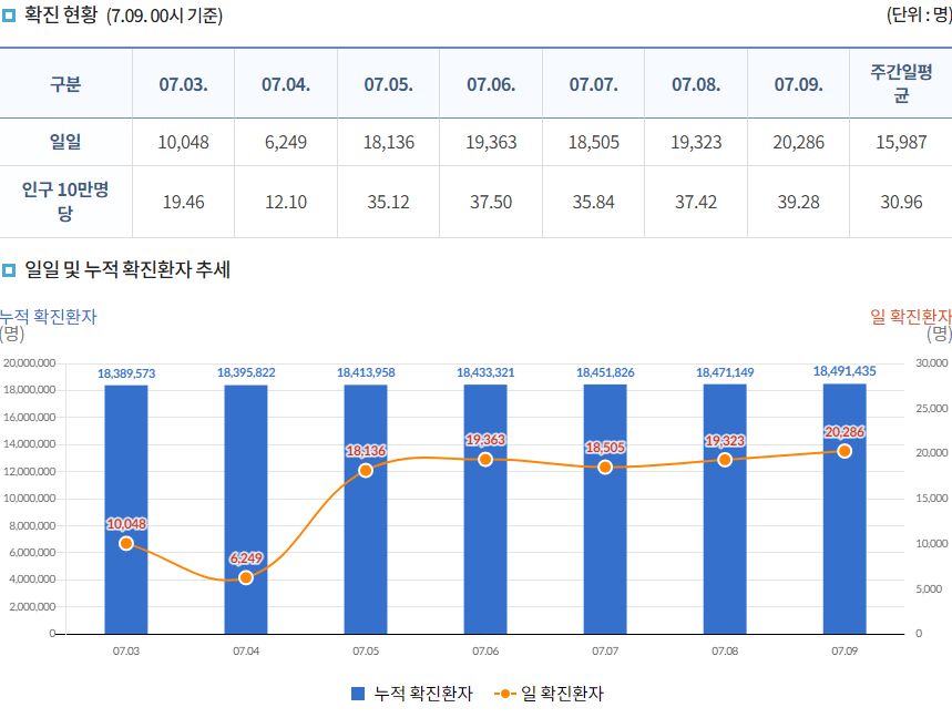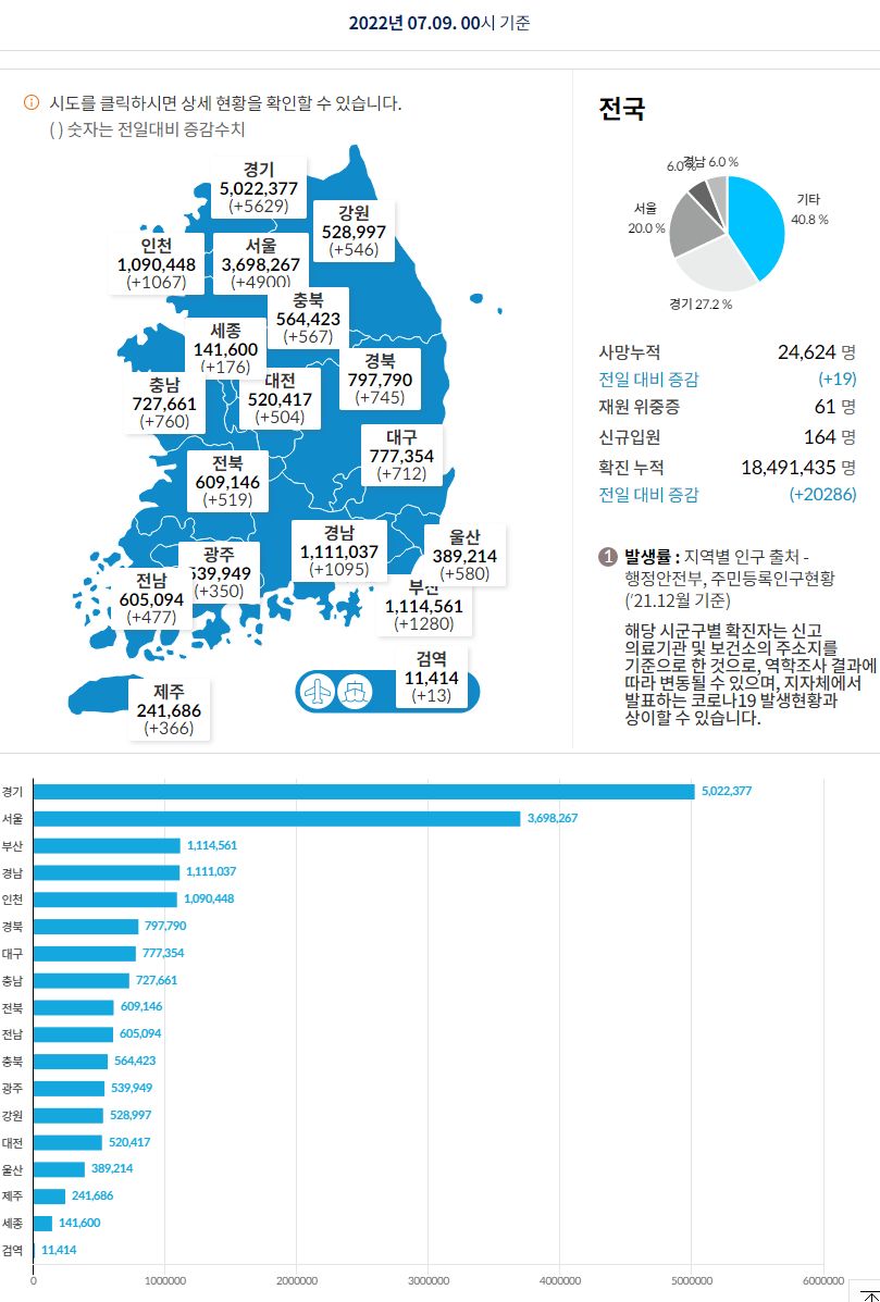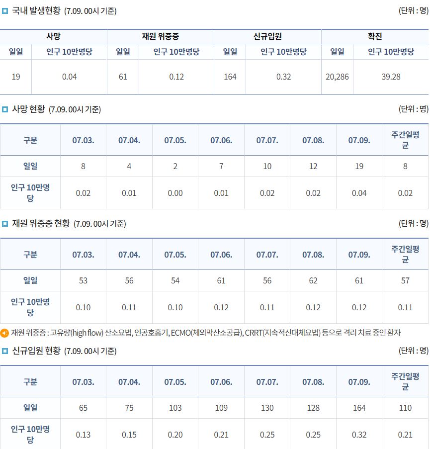 코로나19집계(2022.7.9. 0시기준): 확진 +2만, 사망 +19, 재택치료 9.6만(집중관리 3.6천) 본문