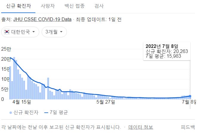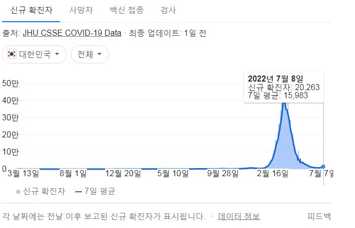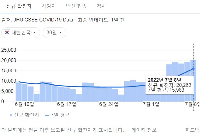 그림먼저 올립니다. 일일확진자 2만 명을 다시 넘었습니다. 사망자와 위중증환자수도 다시 늘고 있습니다.
