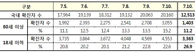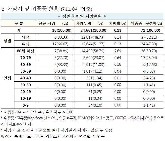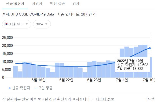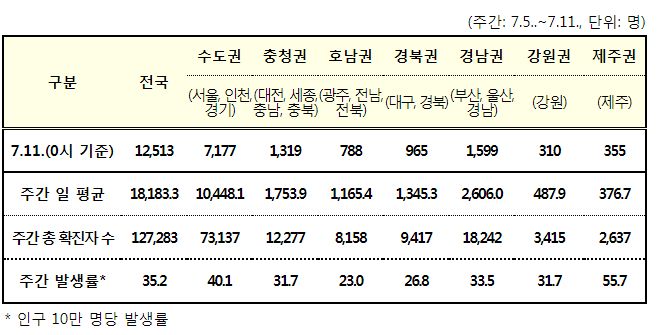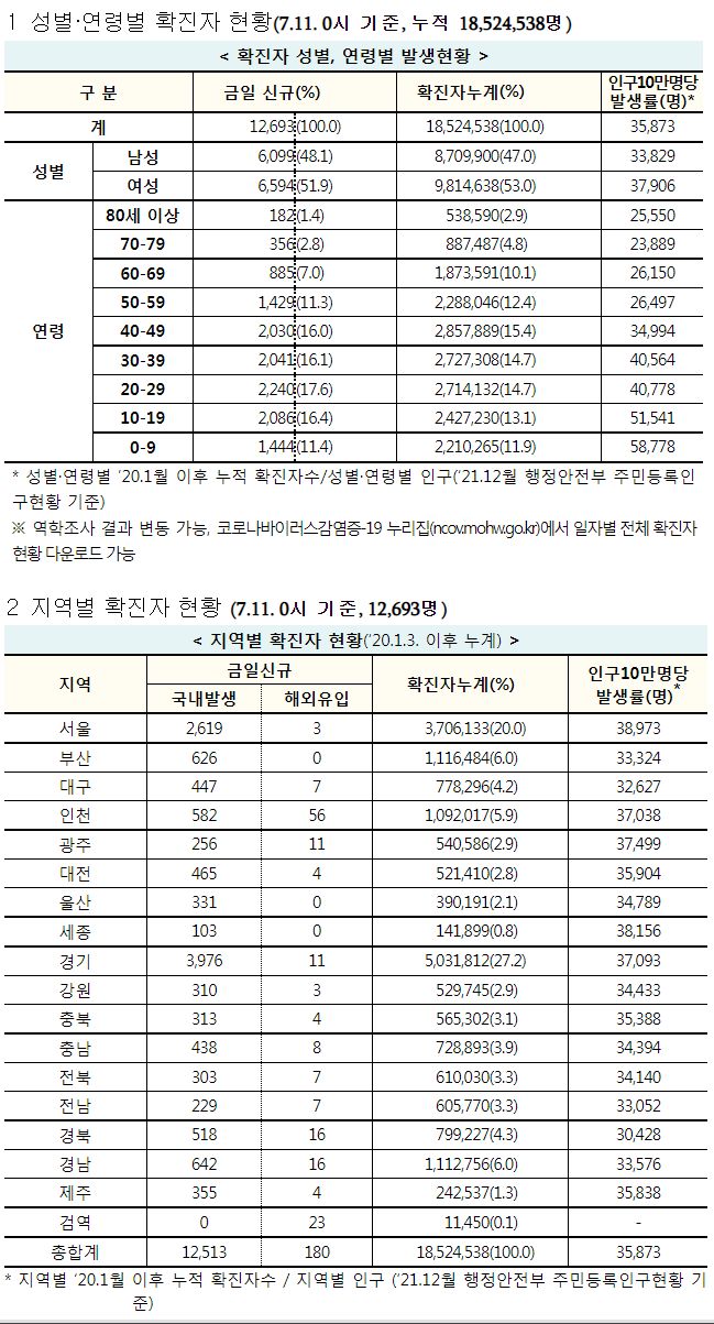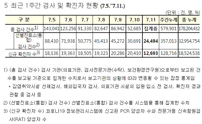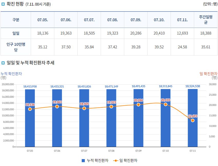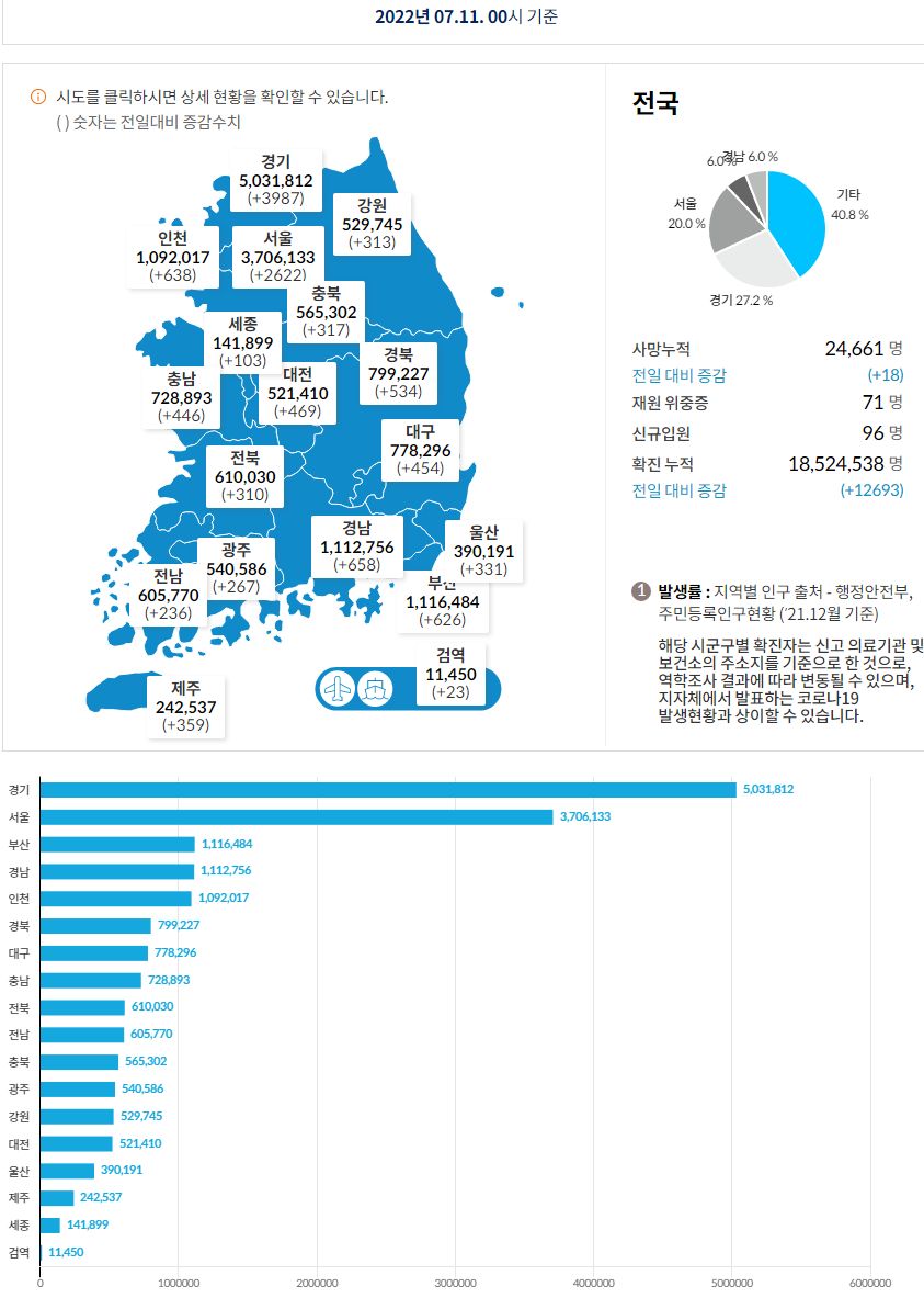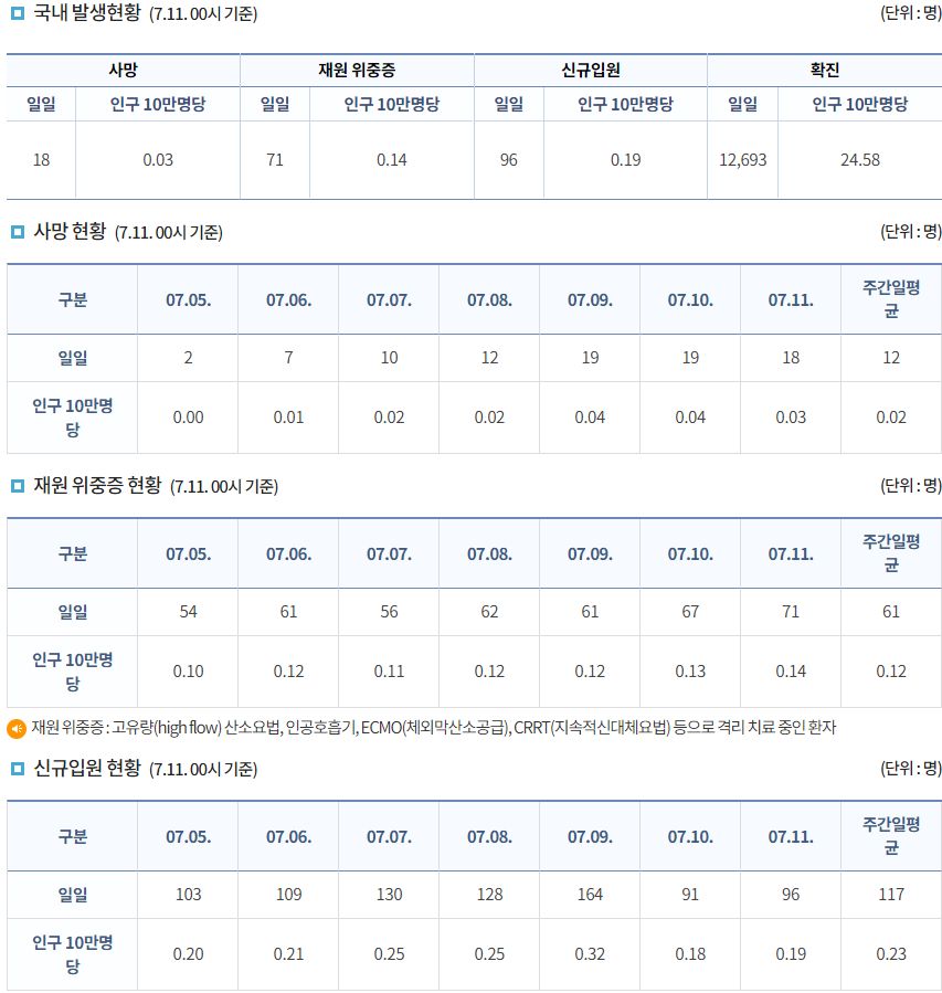 코로나19집계(2022.7.11. 0시기준): 확진 +1.3만, 사망 +18명, 재택치료 10.9만(집중관리 4천) 본문