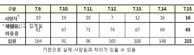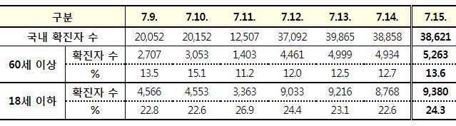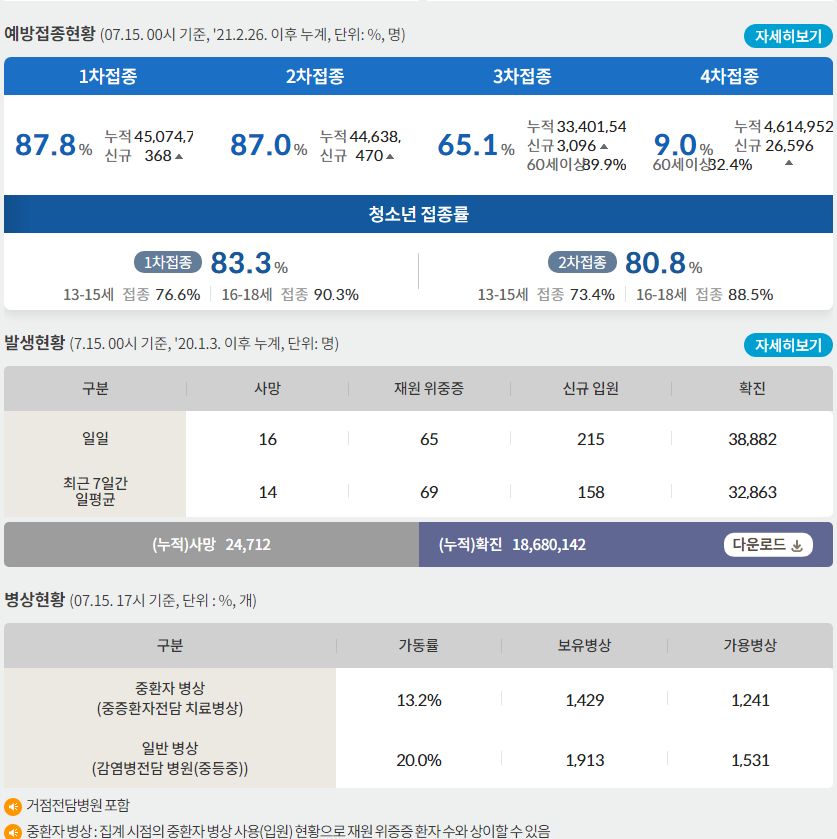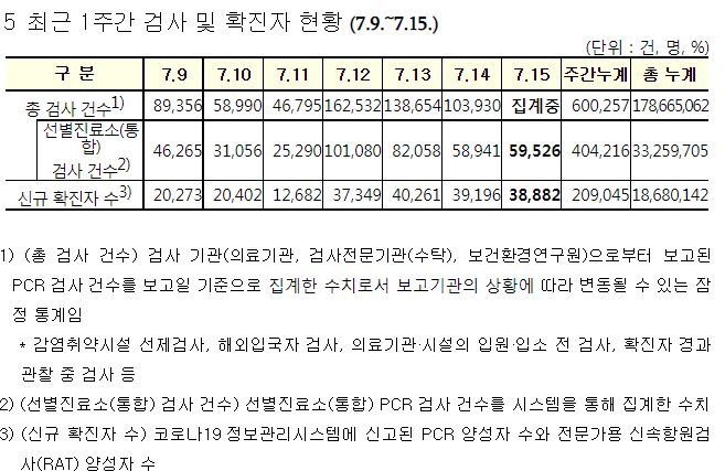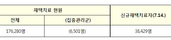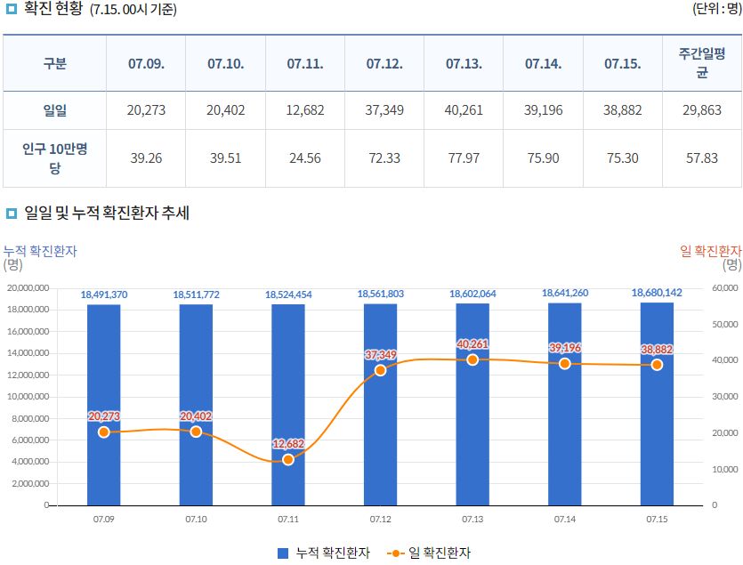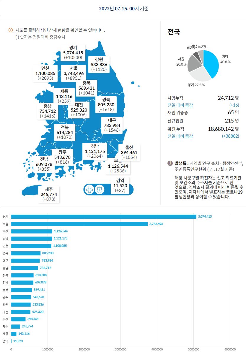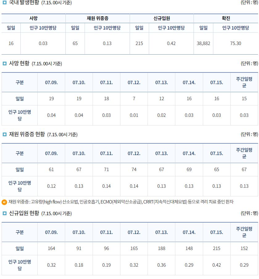 코로나19집계(2022.7.15. 0시기준): 확진 +3.9만, 사망 +16명, 재택치료 17.7만(집중관리 6.5천) 본문