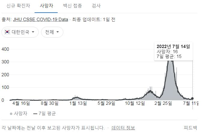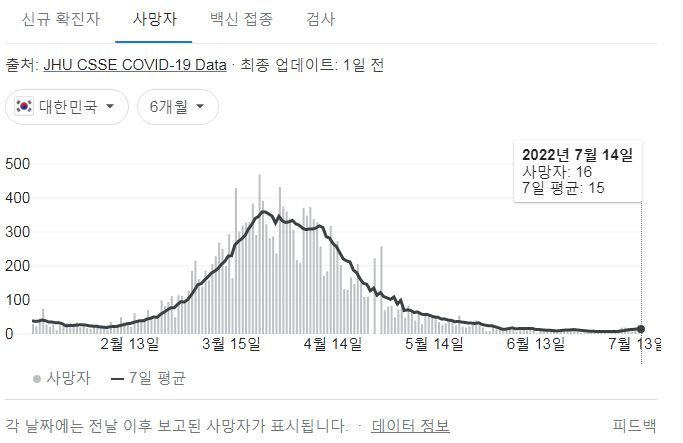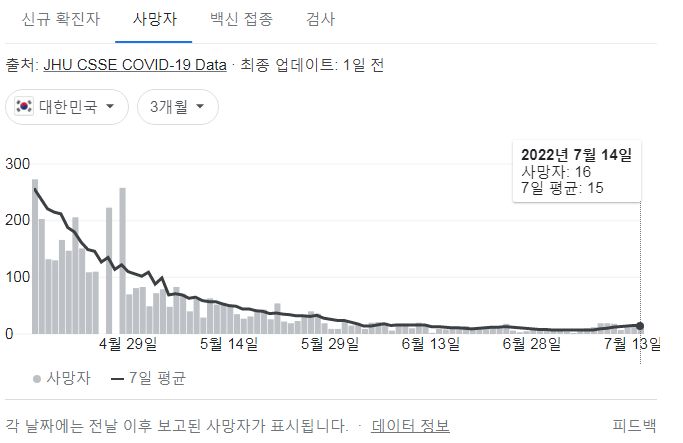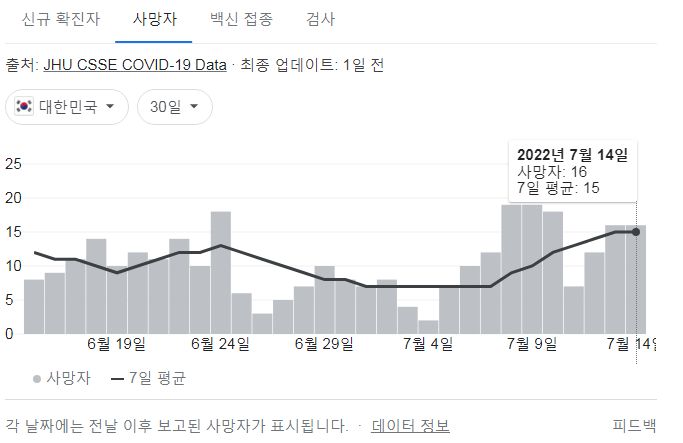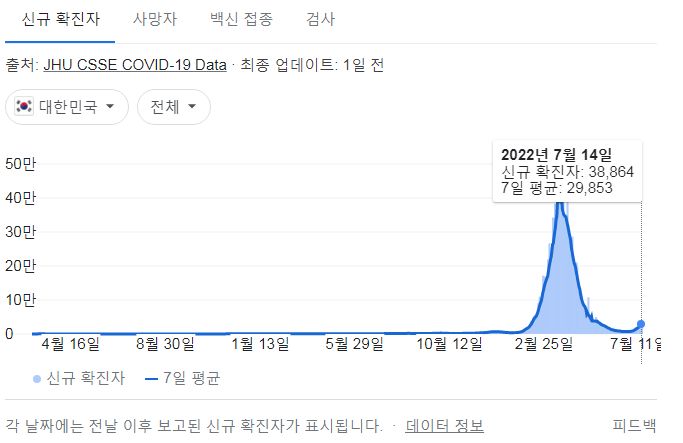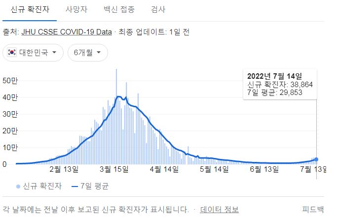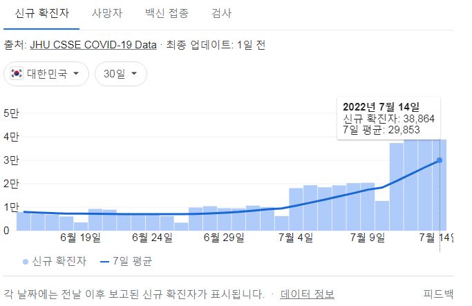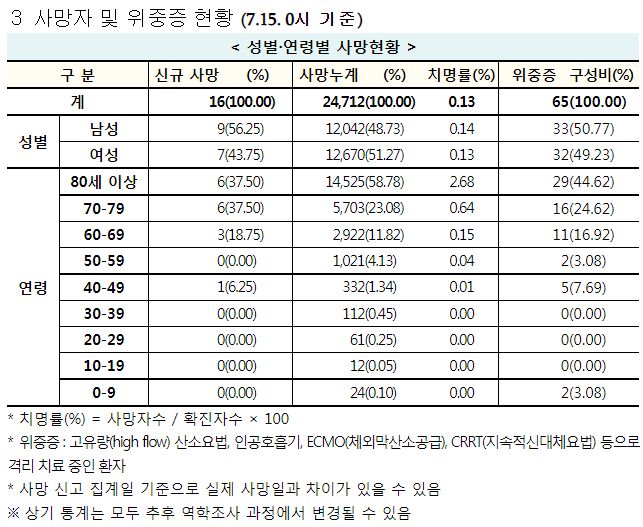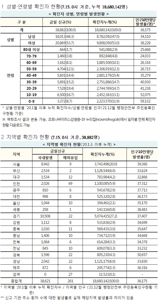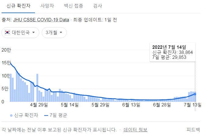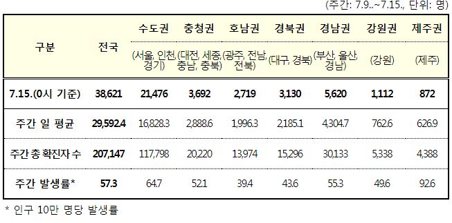 코로나19집계(2022.7.15. 0시기준): 확진 +3.9만, 사망 +16명, 재택치료 17.7만(집중관리 6.5천) 본문