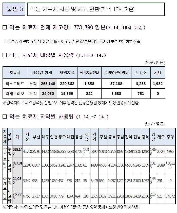먹는 치료제 사용 및 재고: 팍스로비드, 라게브리오
