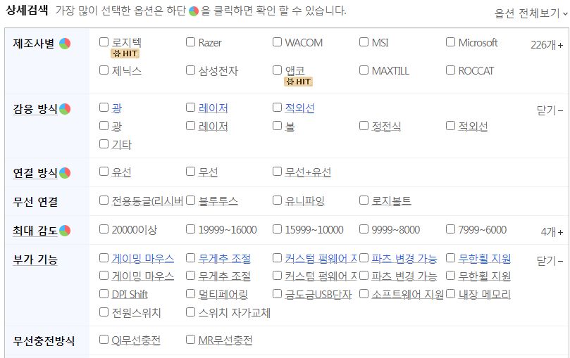 다나와의 마우스 항목. 필터 옵션에 있는 "감응 방식"은 커서이동하는 마우스 바닥이야기다. 휠이 아니다.