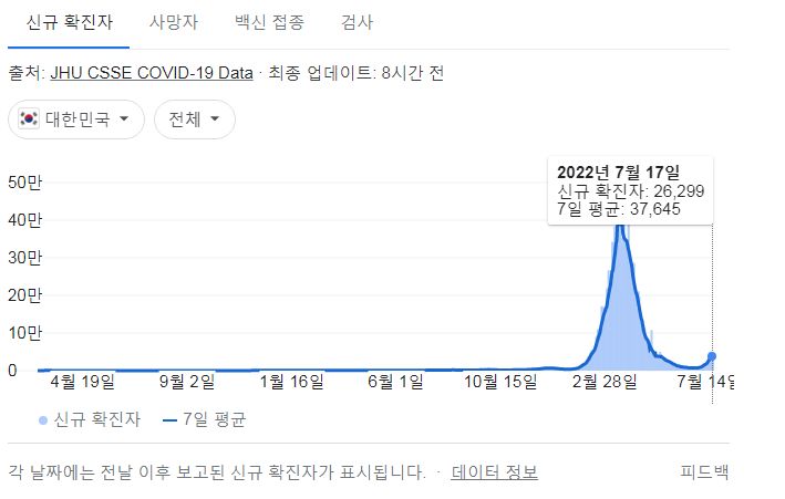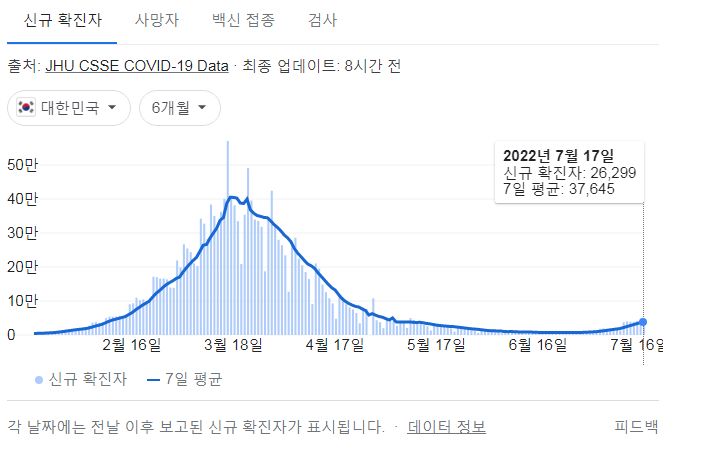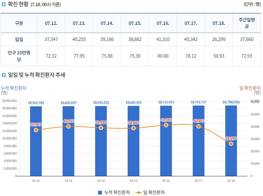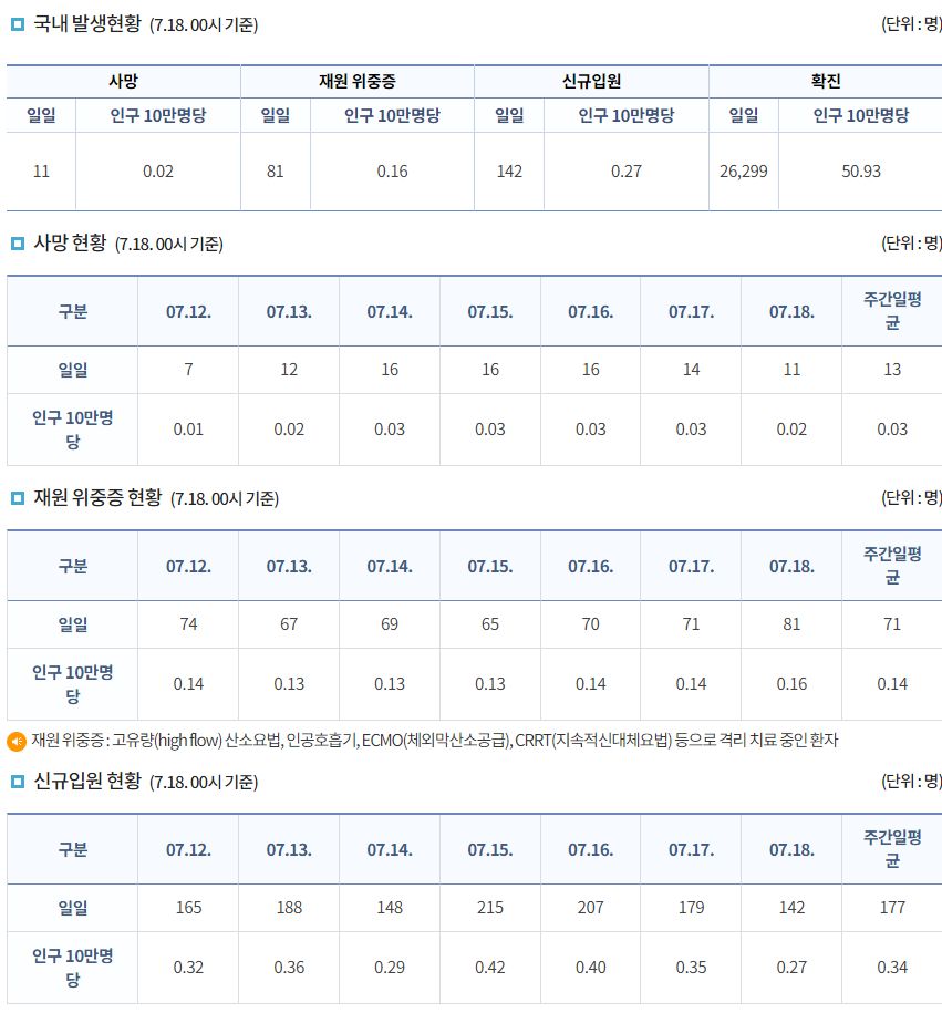 코로나19집계(2022.7.18. 0시기준): 확진 +2.6만, 사망 +11명, 재택치료 22만(집중관리 8.2천) 본문