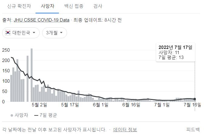 | 코로나19집계(2022.7.19. 0시기준): 확진 +7.4만★, 사망 +12명, 위중증병상가동률 15%, 재택치료 23만(집중관리 8.8천) (0) | 2022.07.19 |