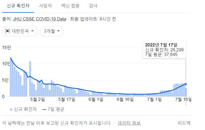 | 코로나19집계(2022.7.16. 0시기준): 확진 +4.1만, 사망 +16명, 재택치료 ? (집중관리 ?) (0) | 2022.07.16 |