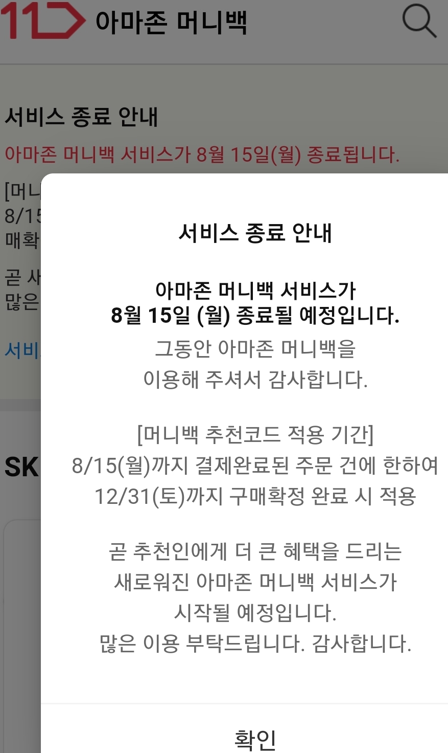 (11번가-아마존) 아마존 머니백 8월 15일 종료 공지 본문