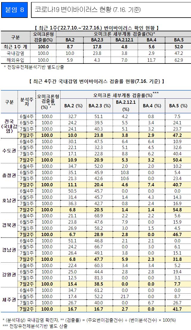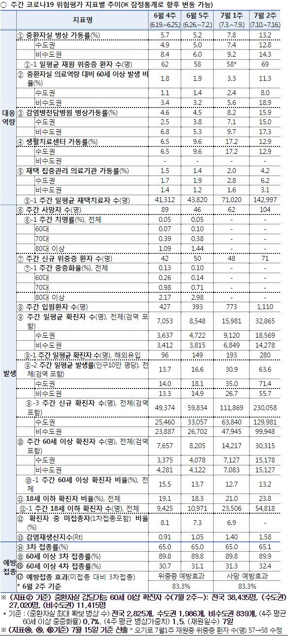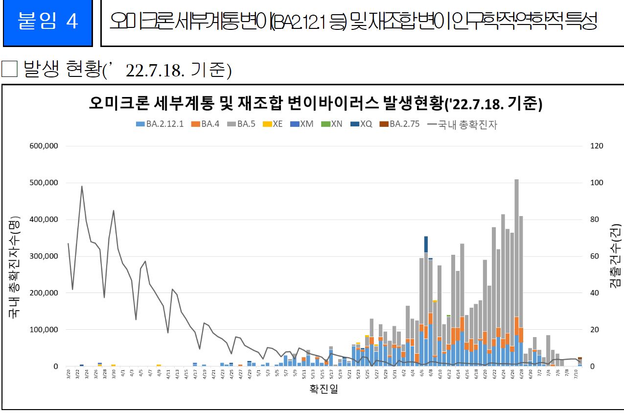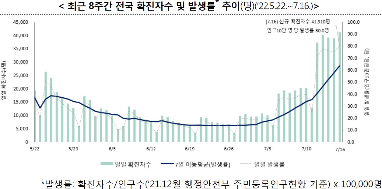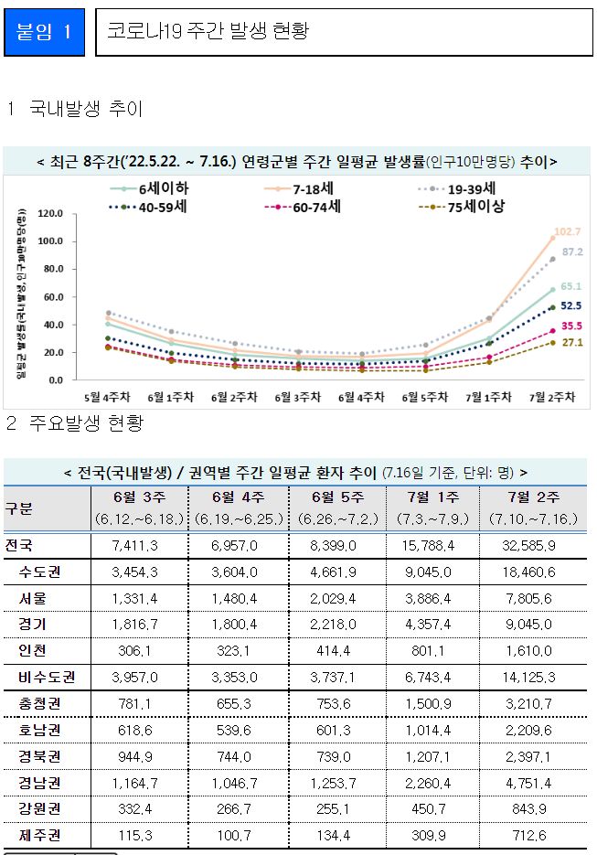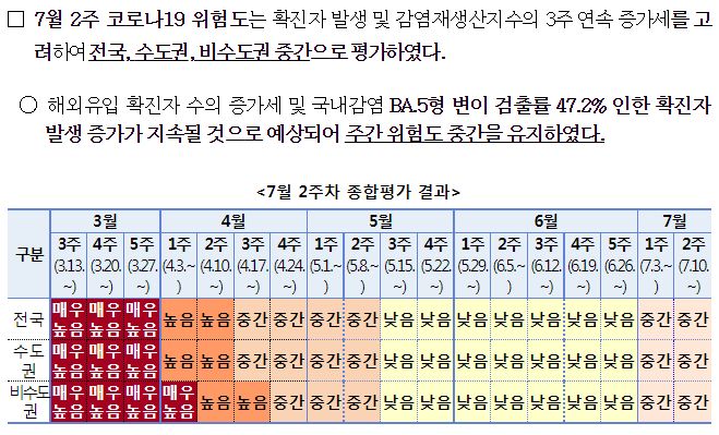 코로나19(2022.7.19) 주간 발생 동향 및 위험도 평가: 위험도 중간. 확진자 증가. 예방접종 정보 등 본문