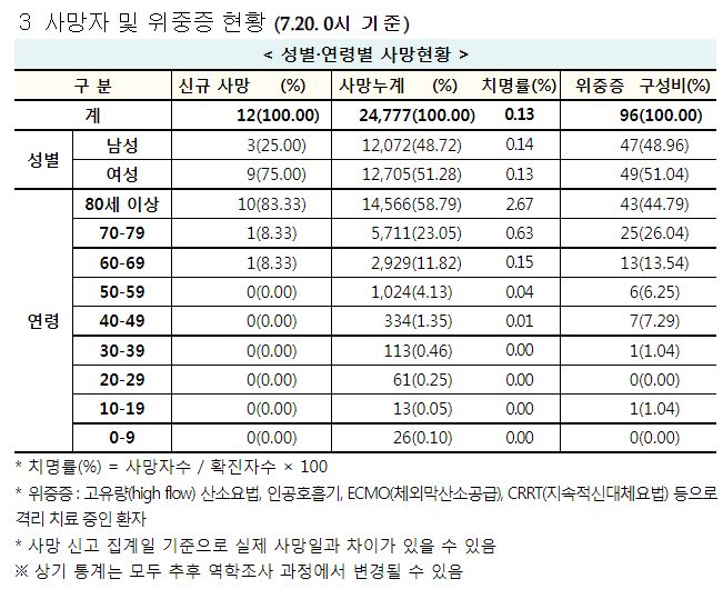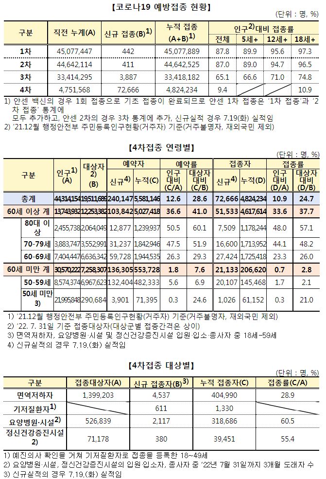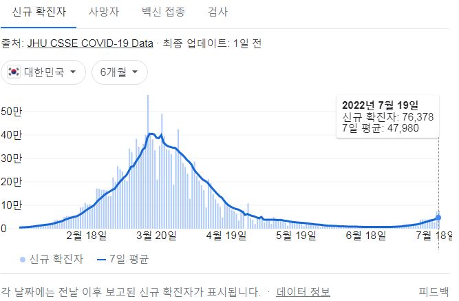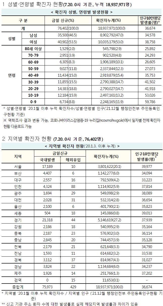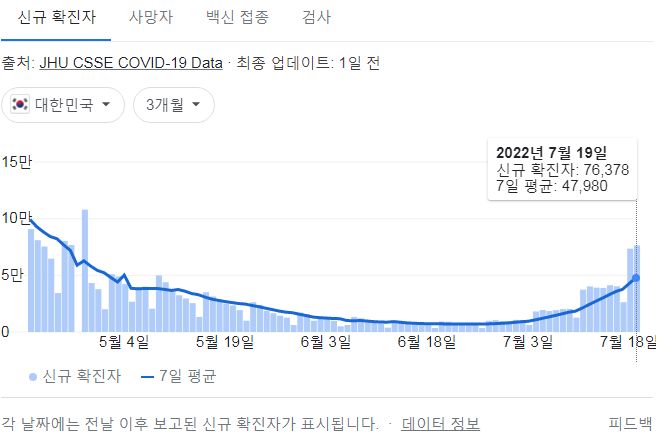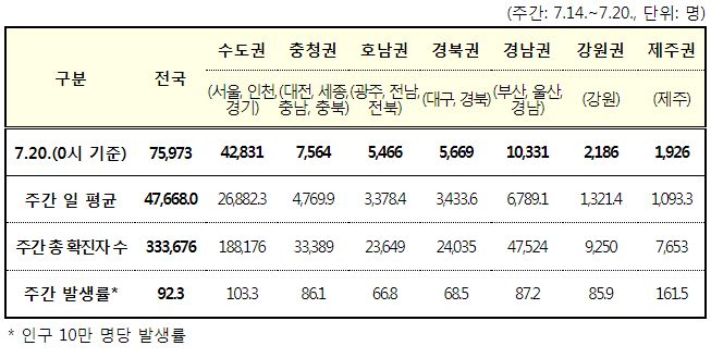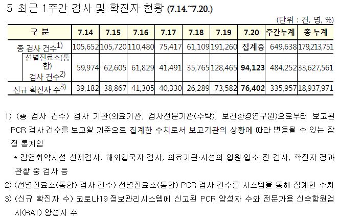 코로나19집계(2022.7.20. 0시기준): 확진 +7.6만, 사망 +12명, 위중증병상가동률 16%, 재택치료 27만(집중관리 1만) 본문