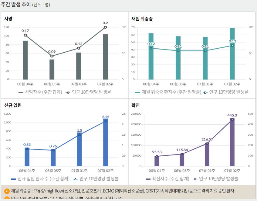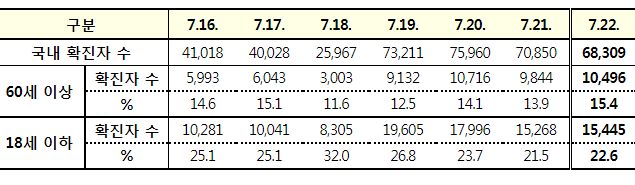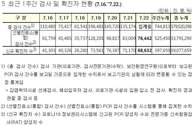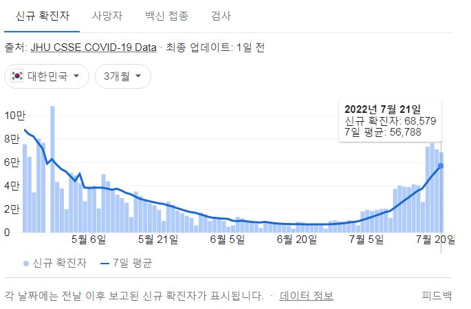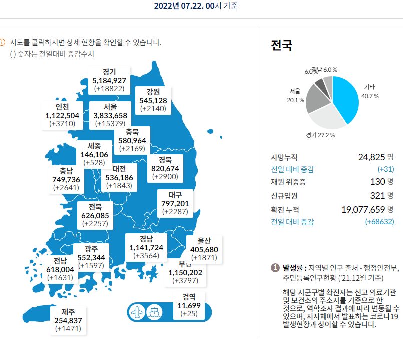 코로나19집계(2022.7.22): 확진 +6.8만, 사망 +31명★, 위중증병상가동률 18%, 재택치료 33만(집중관리 1.2만)/:/ 네이버맵에서 원스톱진료기관찾기 본문