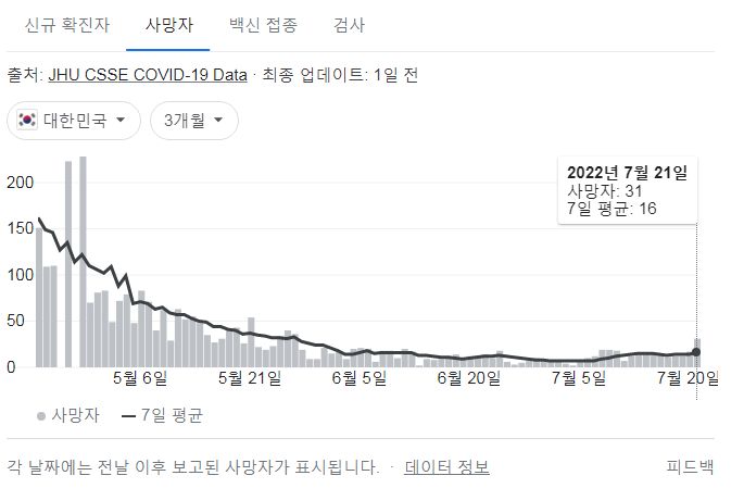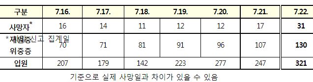 그림먼저 올립니다. 사망자가 눈에 띄게 늘었네요. 전날까지 10명대였다가 31명이 됐습니다.