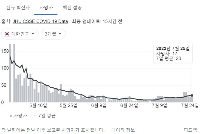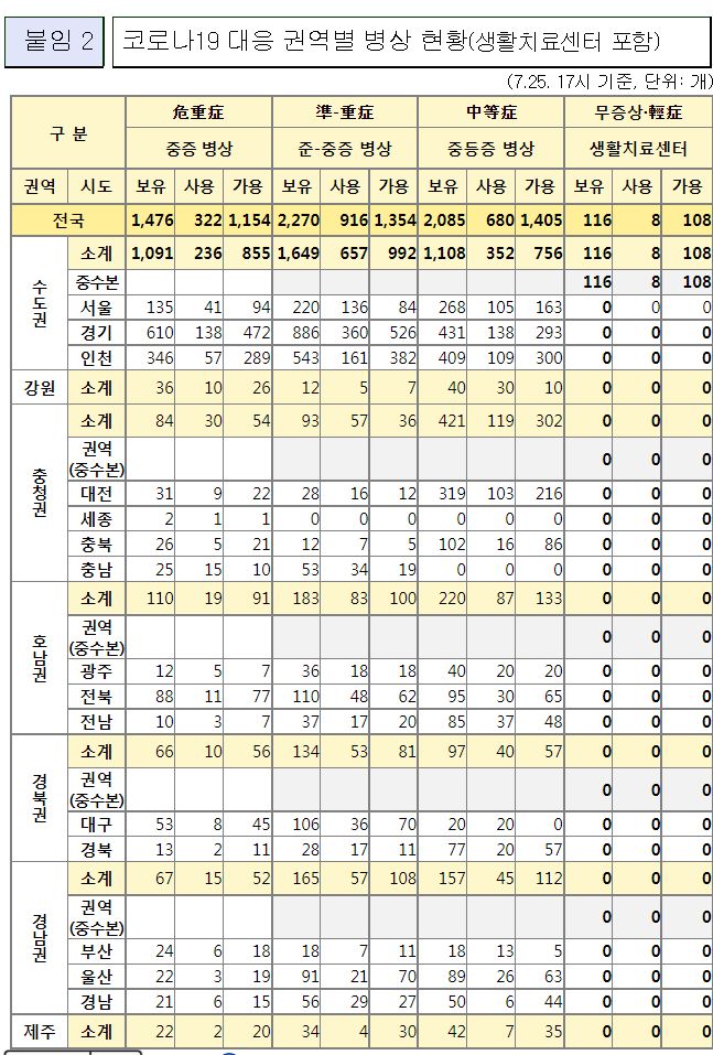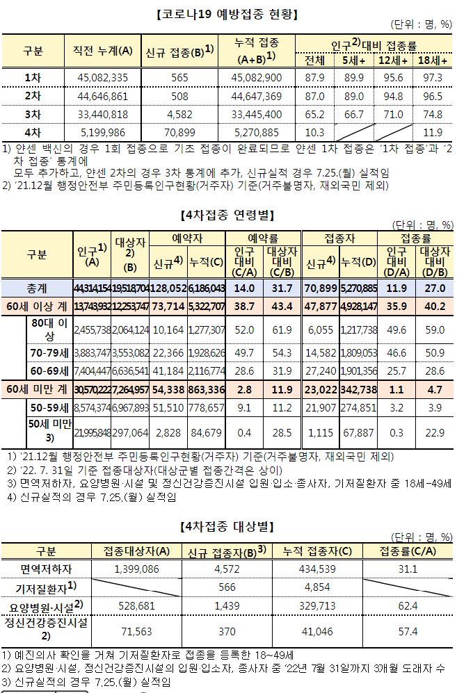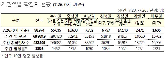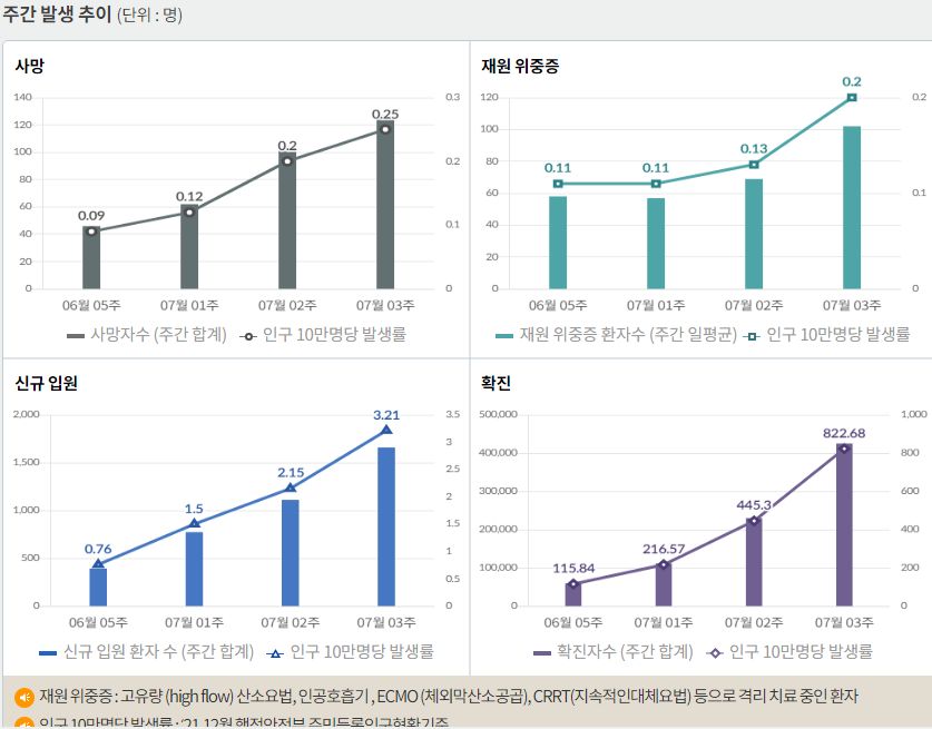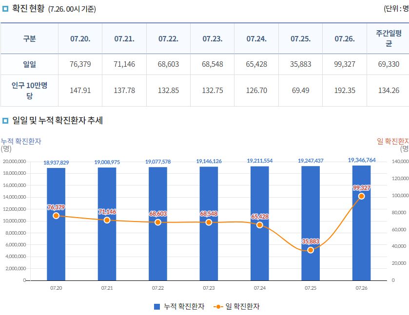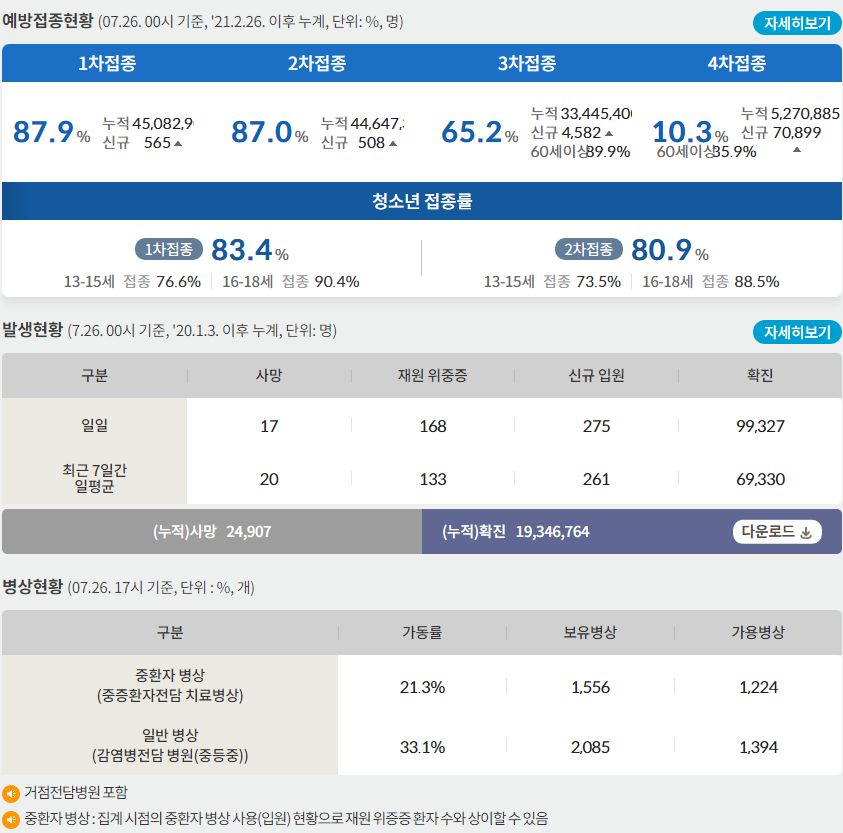 코로나19(2022.7.26. 0시기준): 확진 +9.9만, 사망 +17명, 위중증병상가동률 22%, 재택치료 38만(집중관리 1.6만) 본문