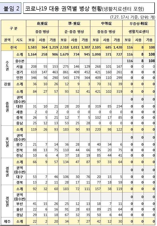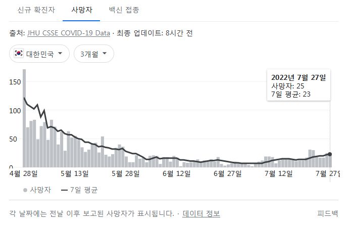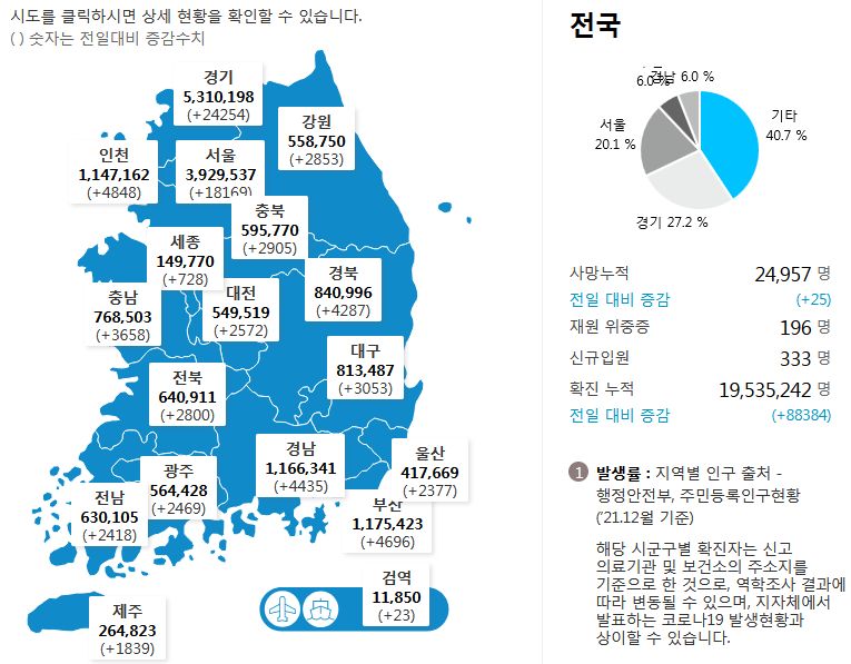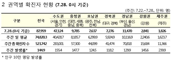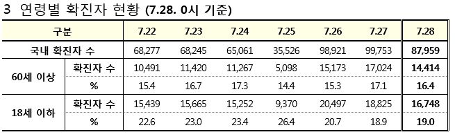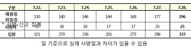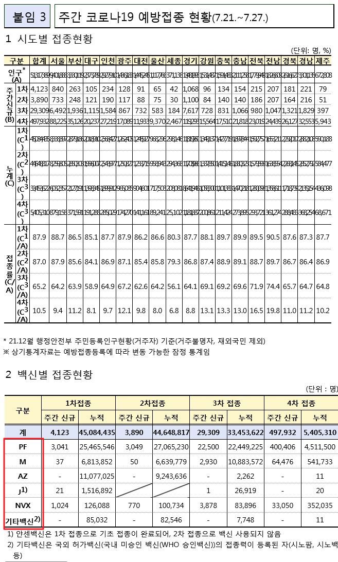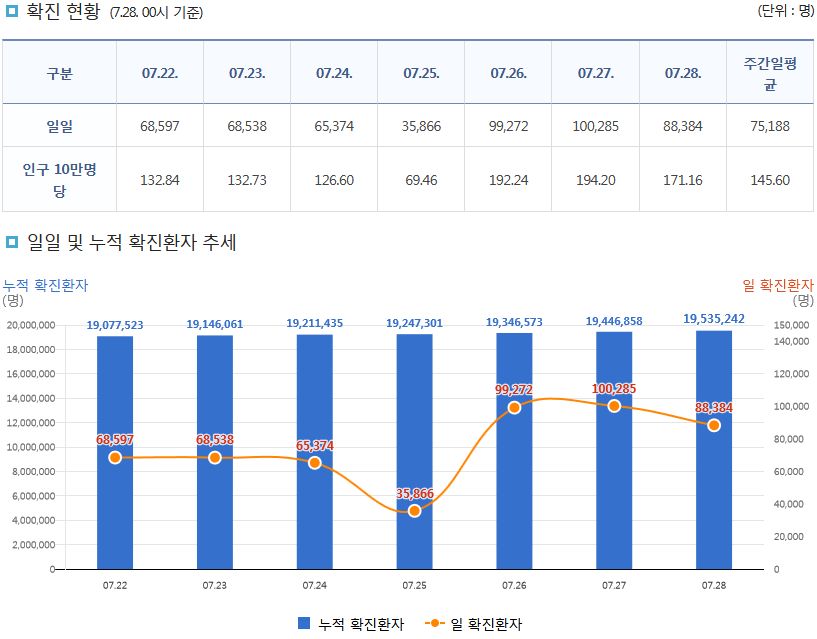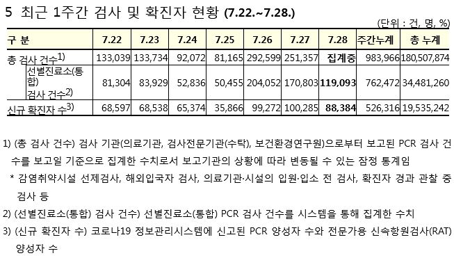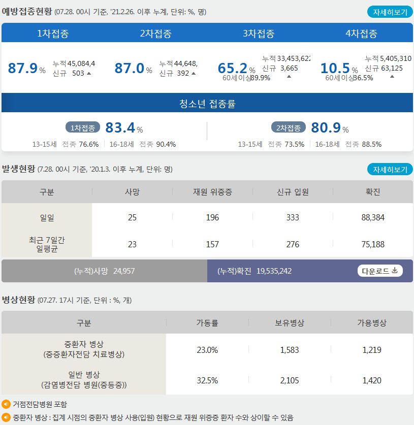코로나19집계(2022.7.28. 0시기준): 확진 +8.8만, 사망 +25명, 위중증병상가동률 23%, 재택치료 43만(집중관리 1.9만)/:/주간 예방접종 통계 본문