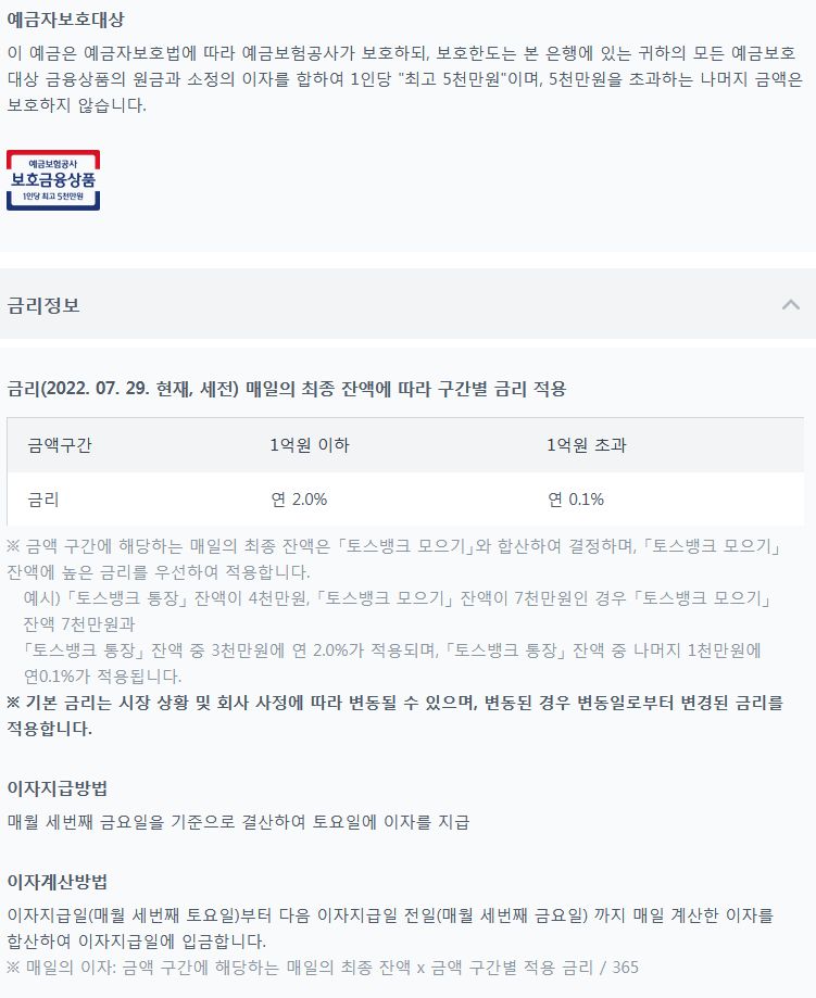 토스뱅크 통장: 자유입출금, 금리 2%, 5천만원 예금자보호 등 본문