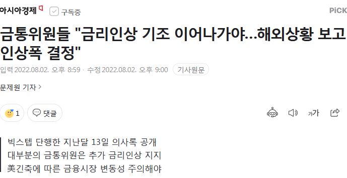한국은행 금융통화위원들은 지난달 사상 첫 '빅스텝(기준금리 0.50%포인트 인상)'을 단행하면서 앞으로도 추가적인 금리인상이 필요하다고 입을 모았다. 경기 하방 위험이 커진 것은 사실이지만