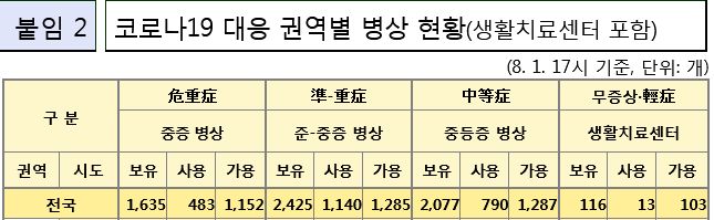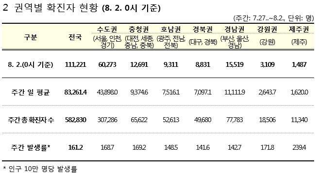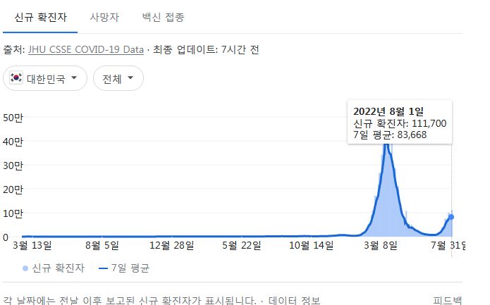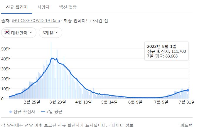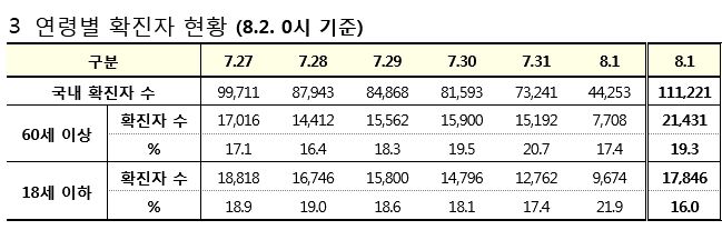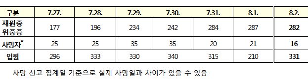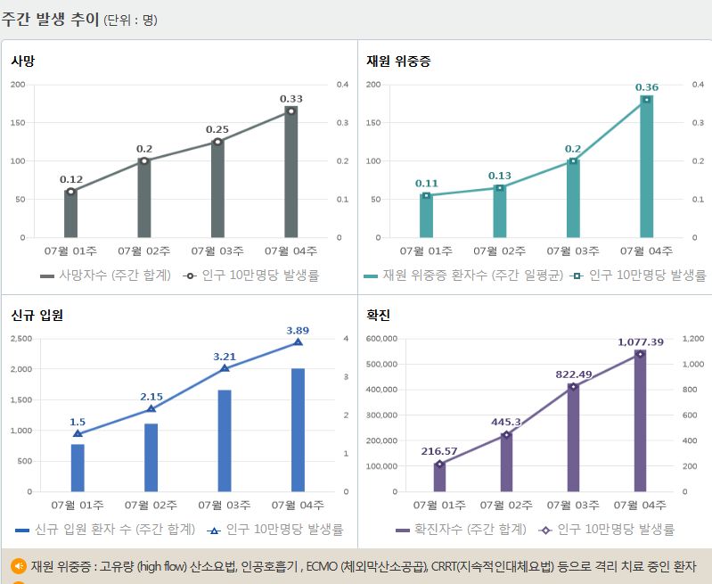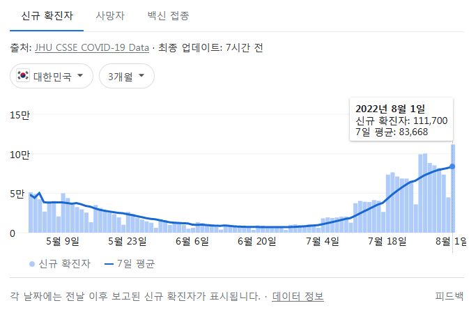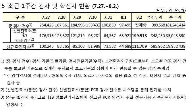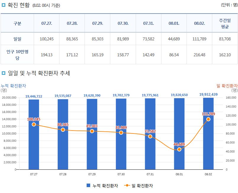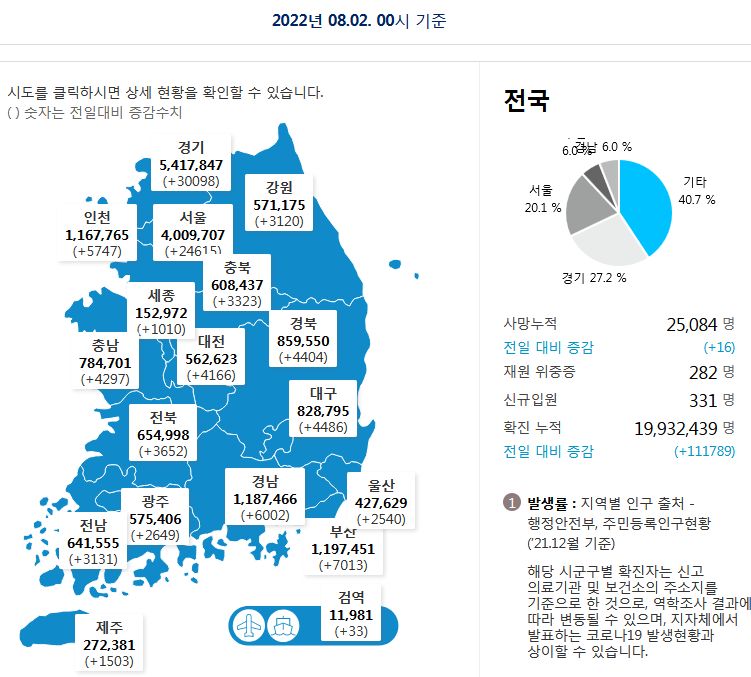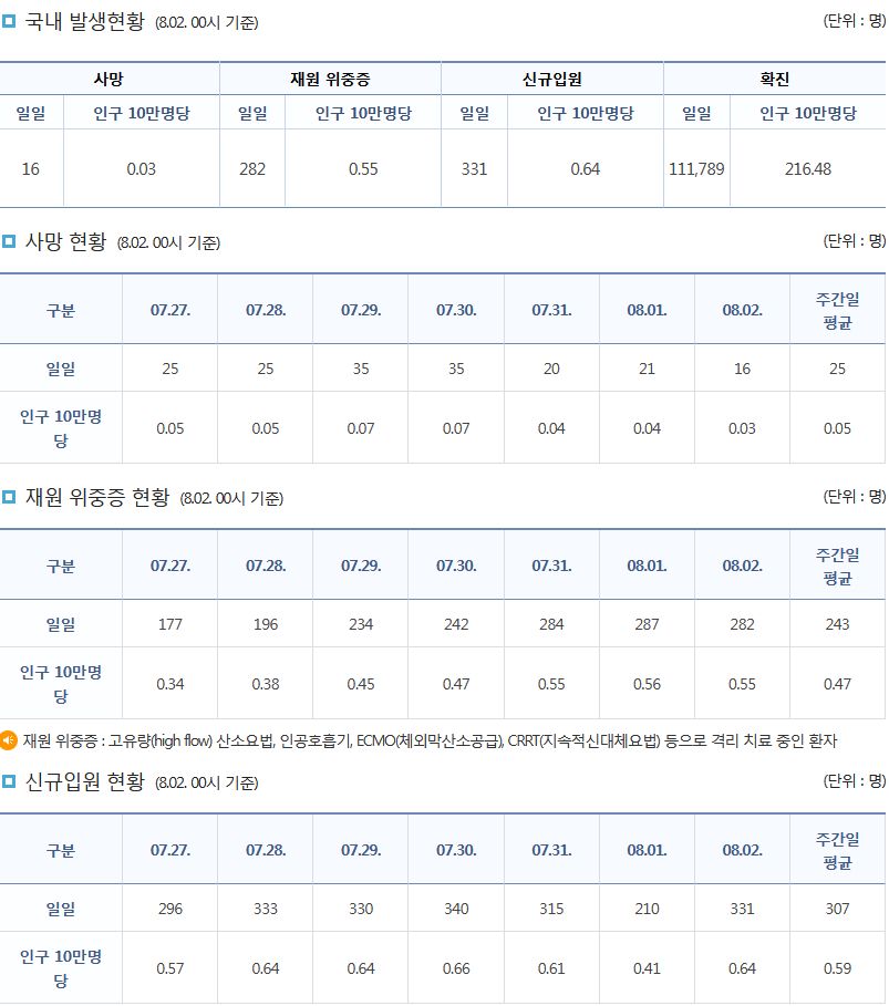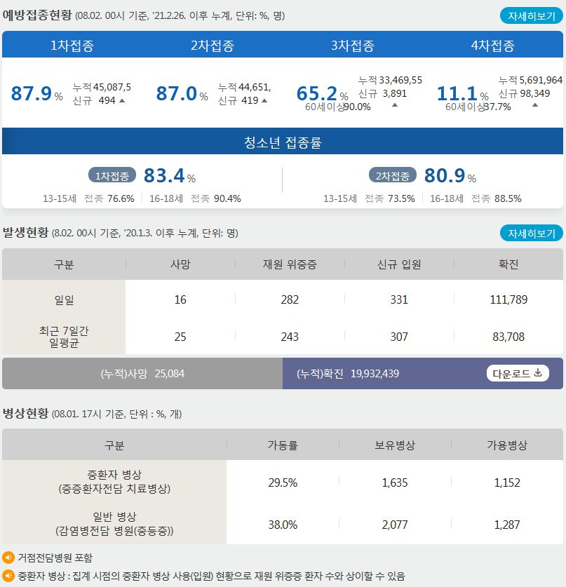 코로나19집계(2022.8.2. 0시기준): 확진 +11만, 사망 +16명, 위중증병상가동률 30%, 재택치료 45만(집중관리 1.8만) 본문