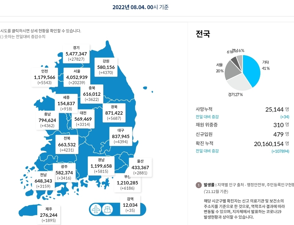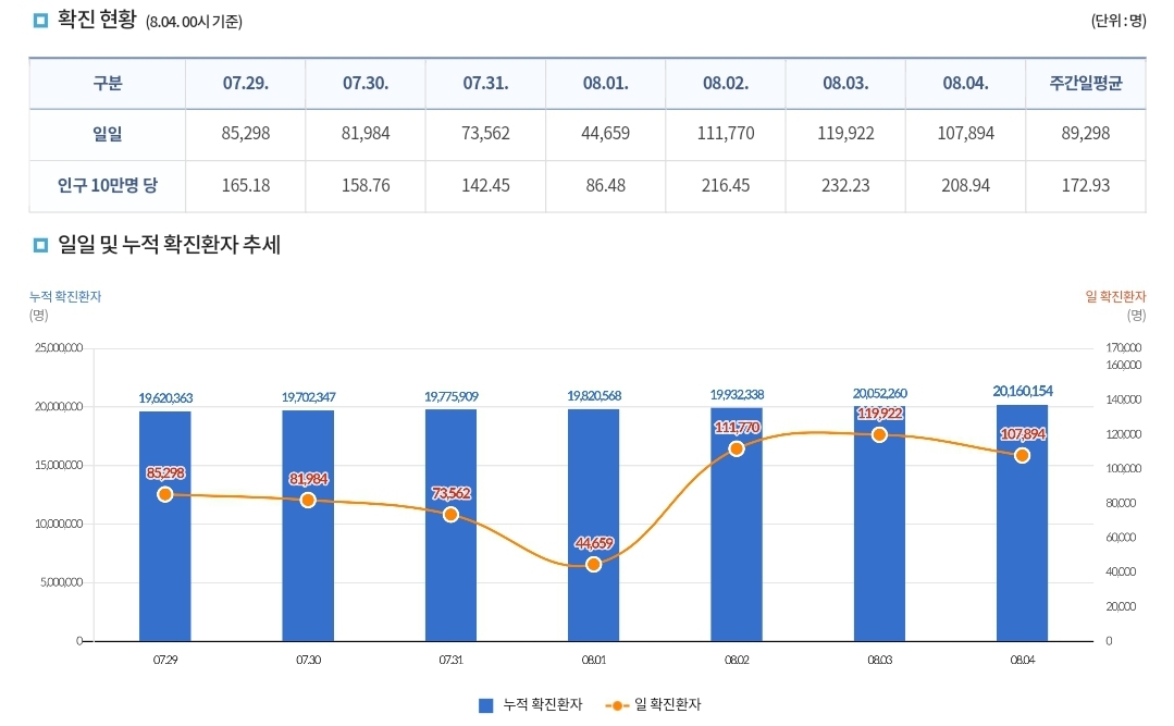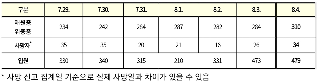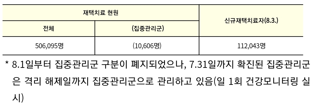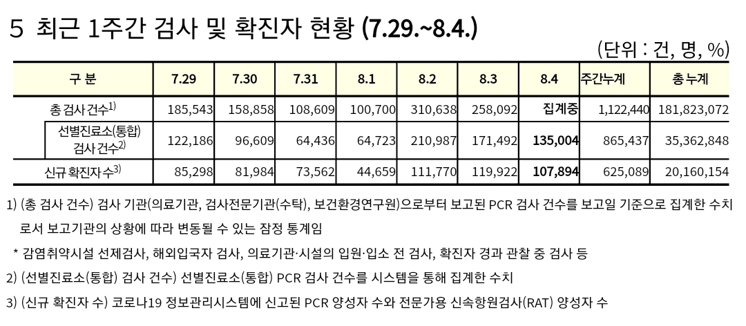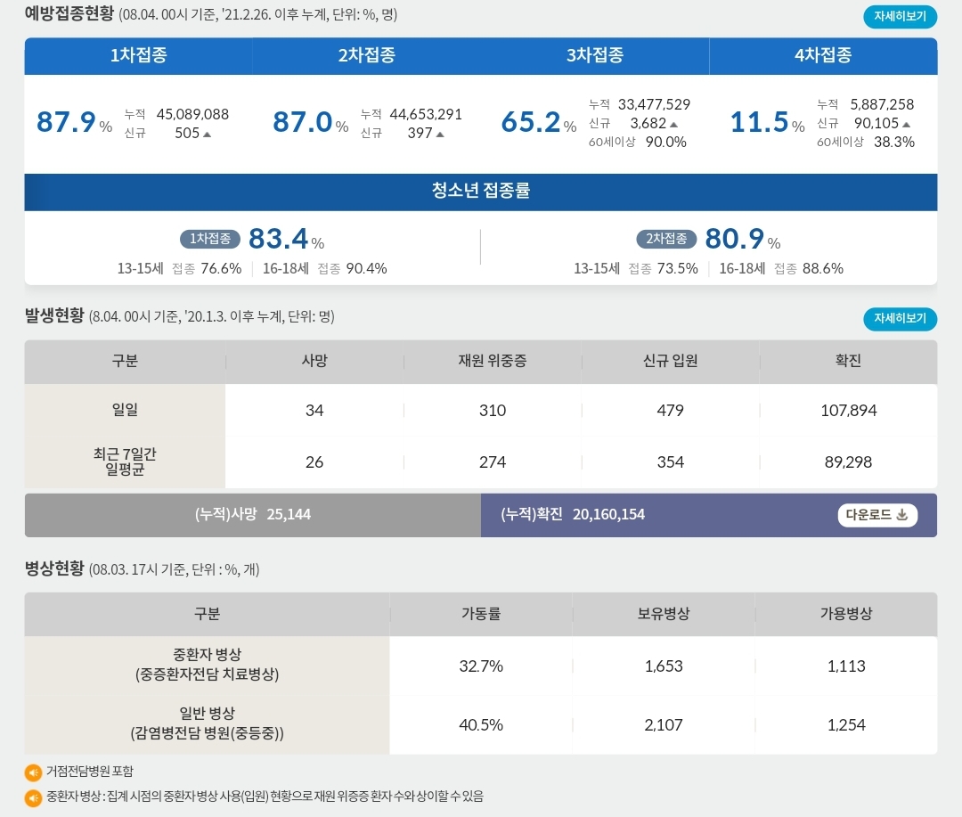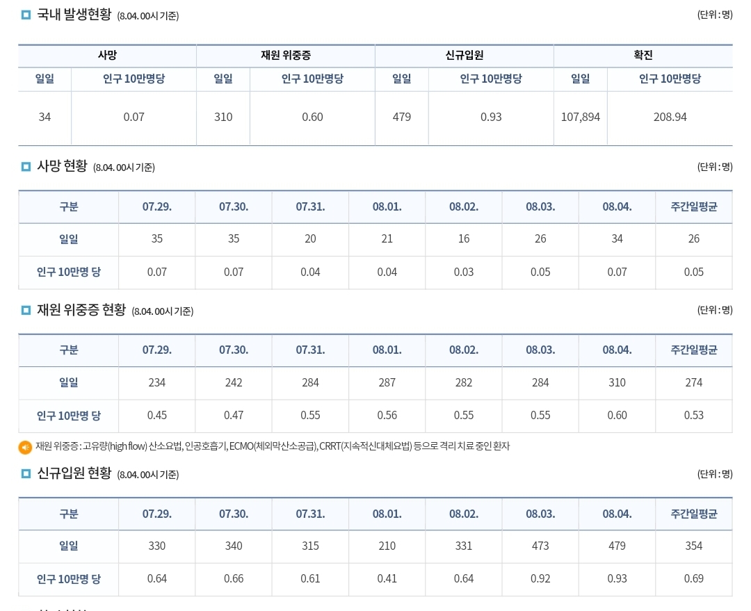 코로나19집계(2022.8.4. 0시기준) 확진 +11만, 사망 +34명, 위중증병상가동률 33%, 재택치료 51만(집중관리 1.1만) 본문