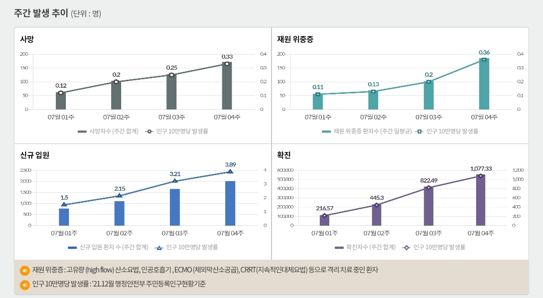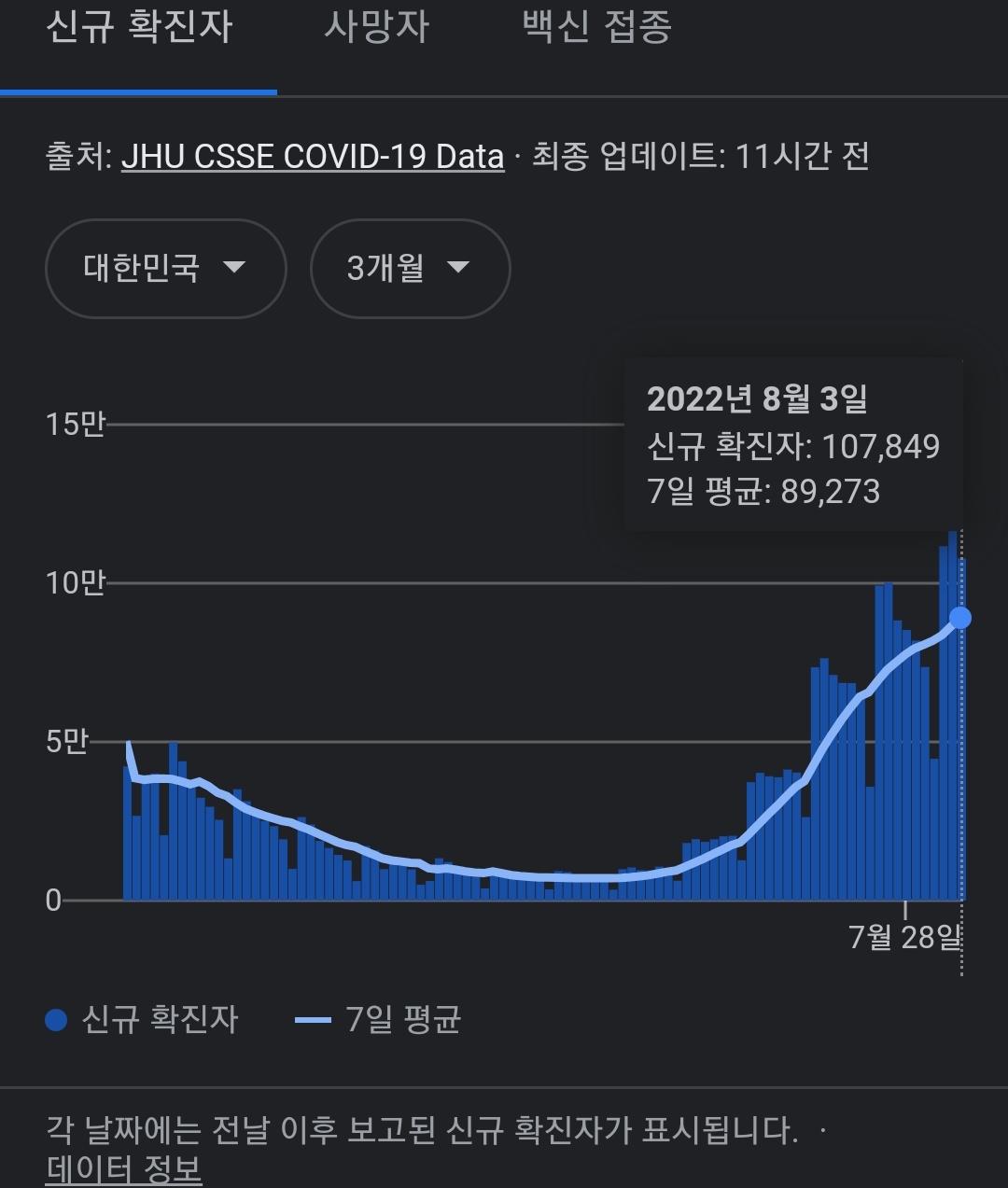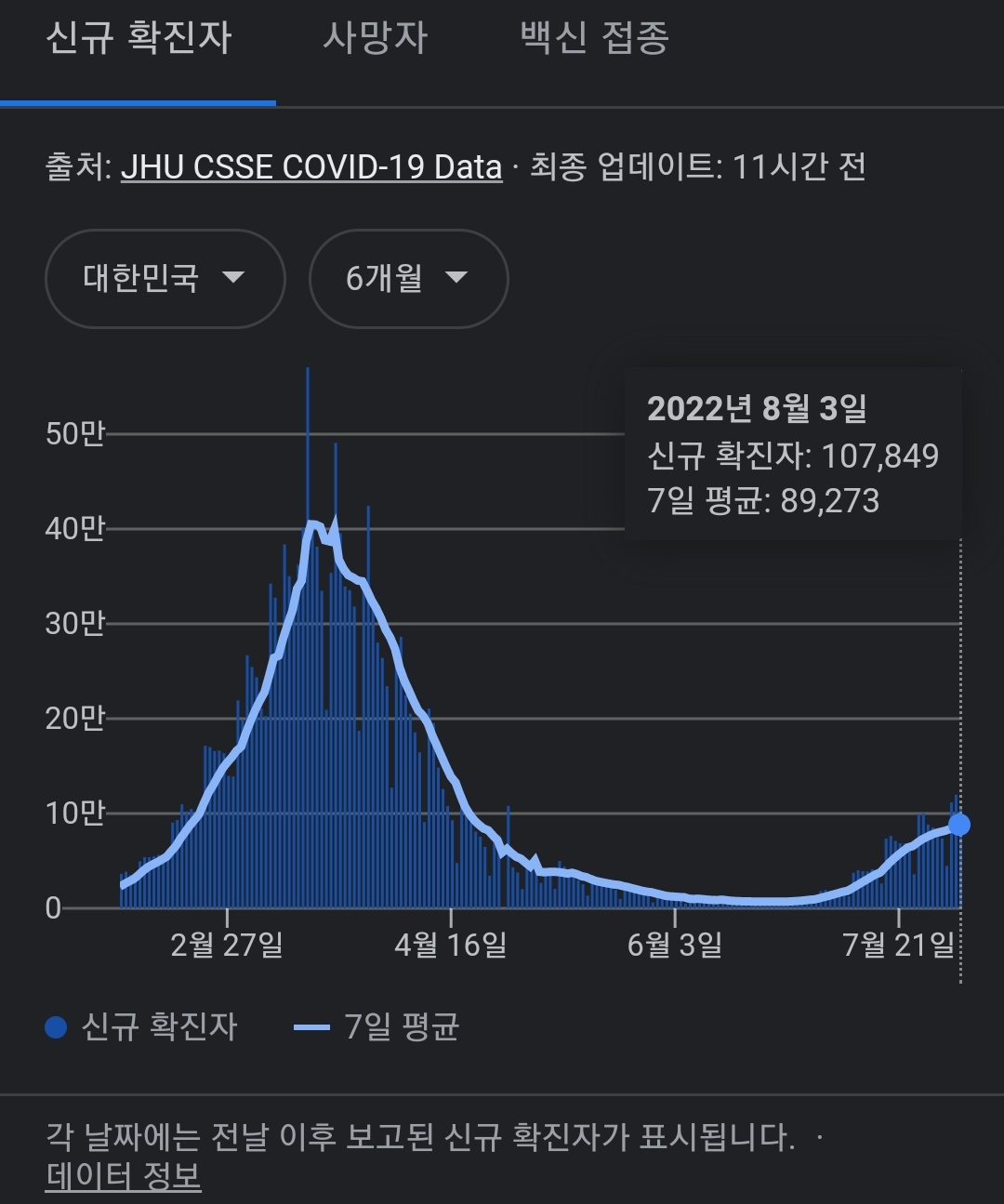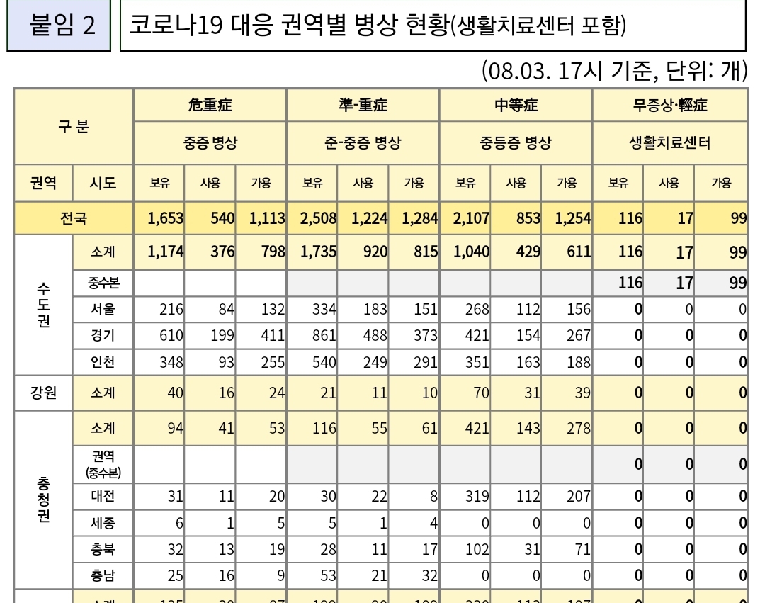 코로나19집계(2022.8.4. 0시기준) 확진 +11만, 사망 +34명, 위중증병상가동률 33%, 재택치료 51만(집중관리 1.1만) 본문