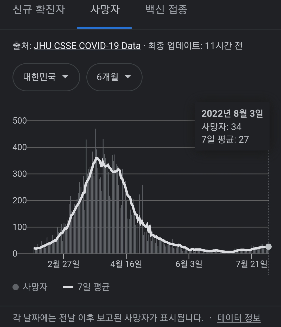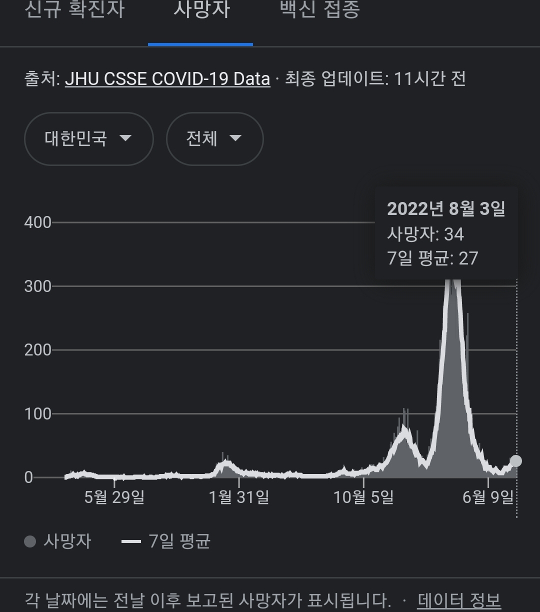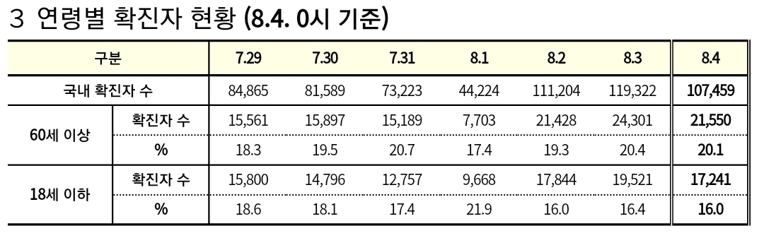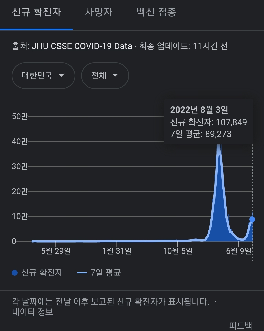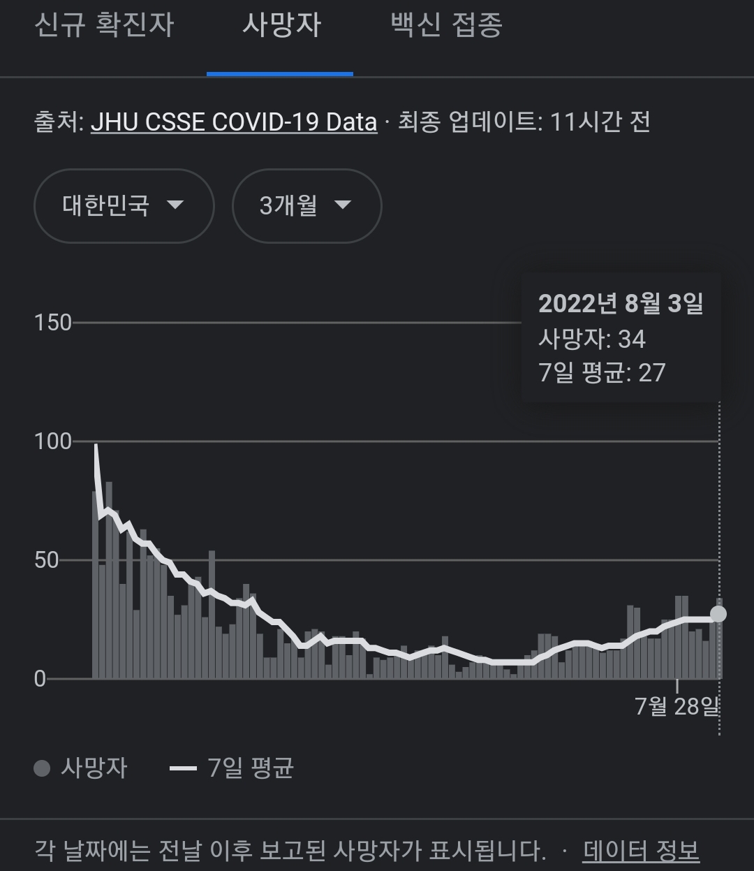 코로나19집계(2022.8.4. 0시기준) 확진 +11만, 사망 +34명, 위중증병상가동률 33%, 재택치료 51만(집중관리 1.1만) 본문