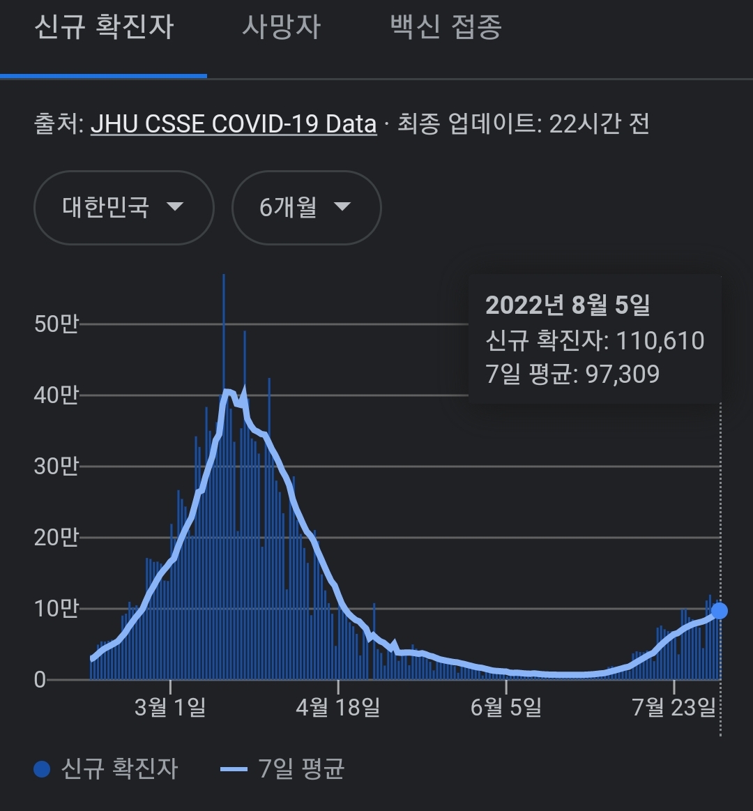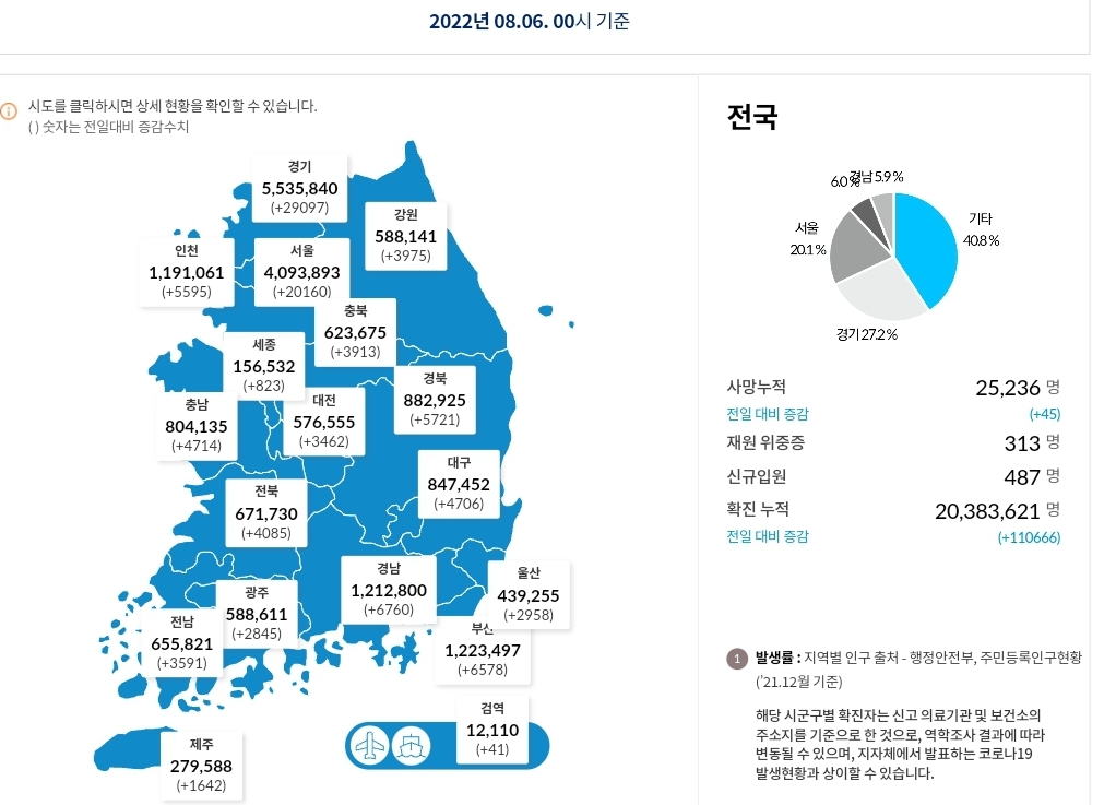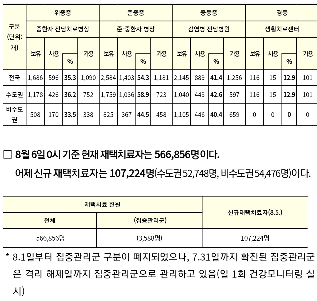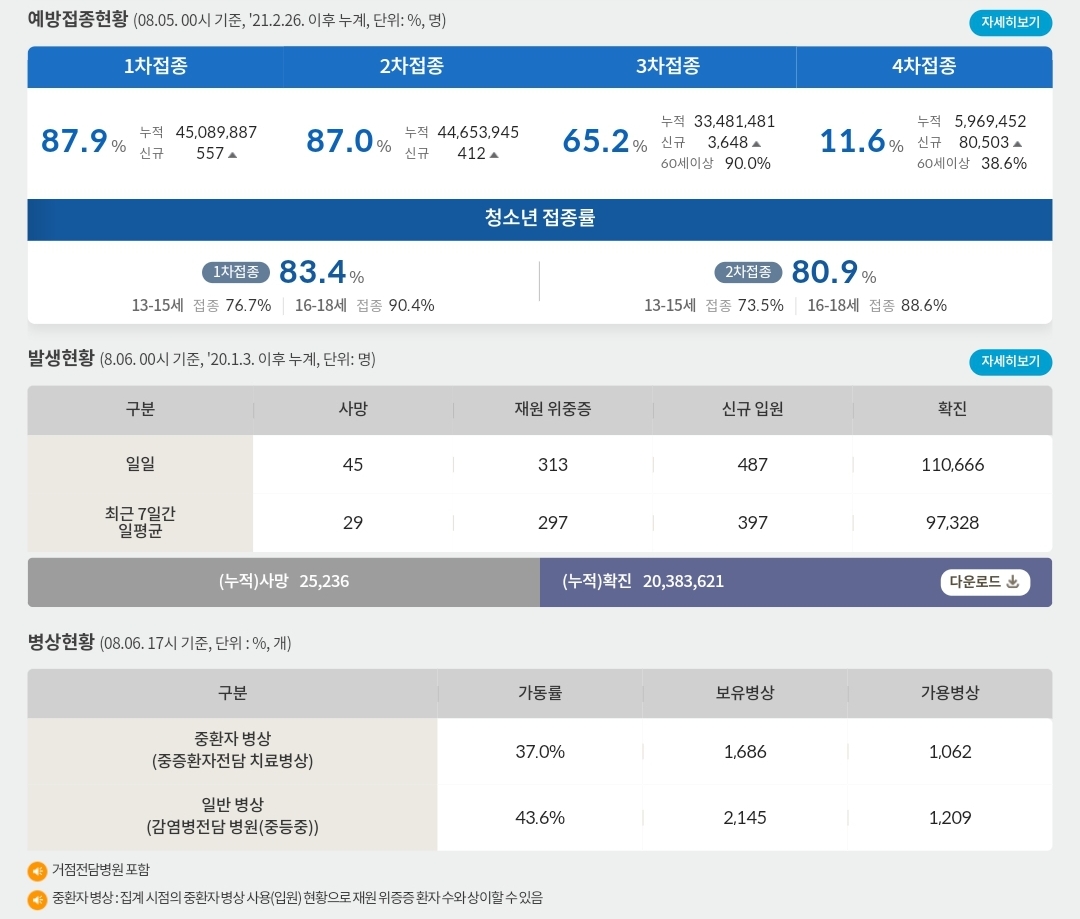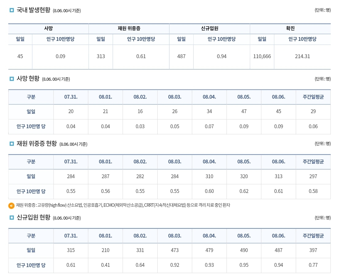 코로나19집계(2022.8.6. 0시기준) 확진 +11만, 사망 +45명, 위중중병상가동률 35%, 재택치료 57만(집중관리 3.6천) 본문