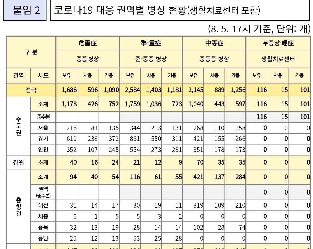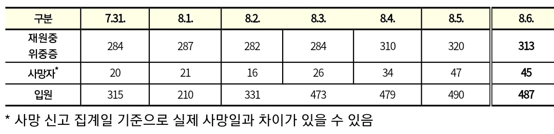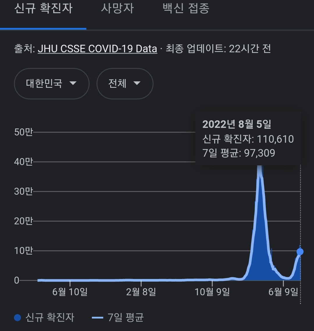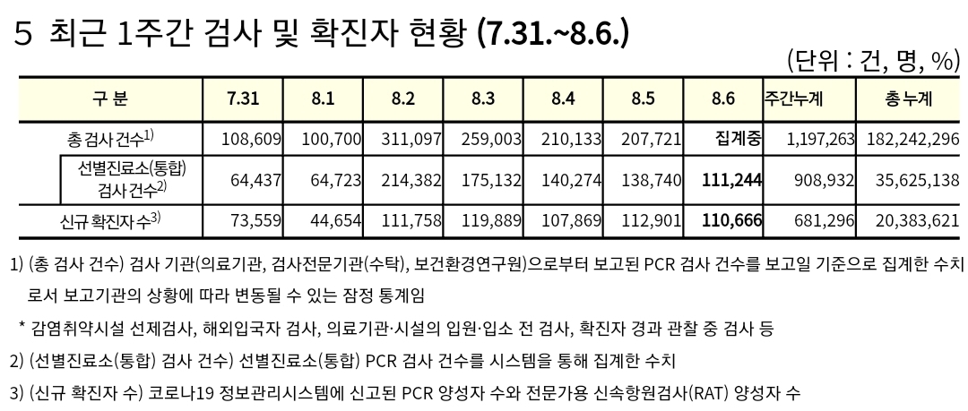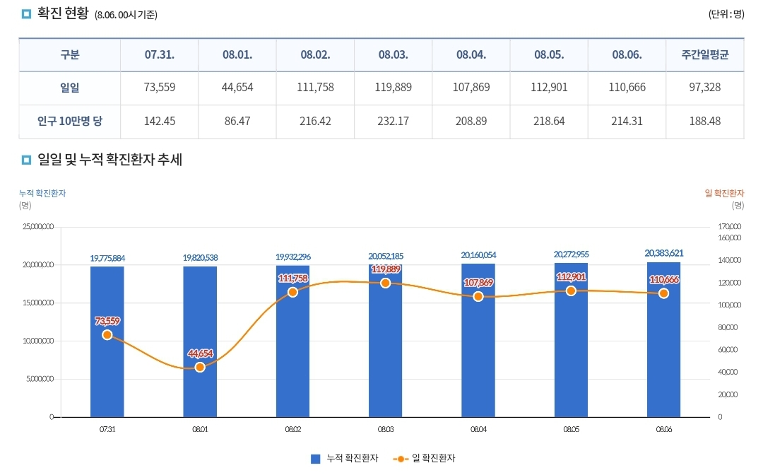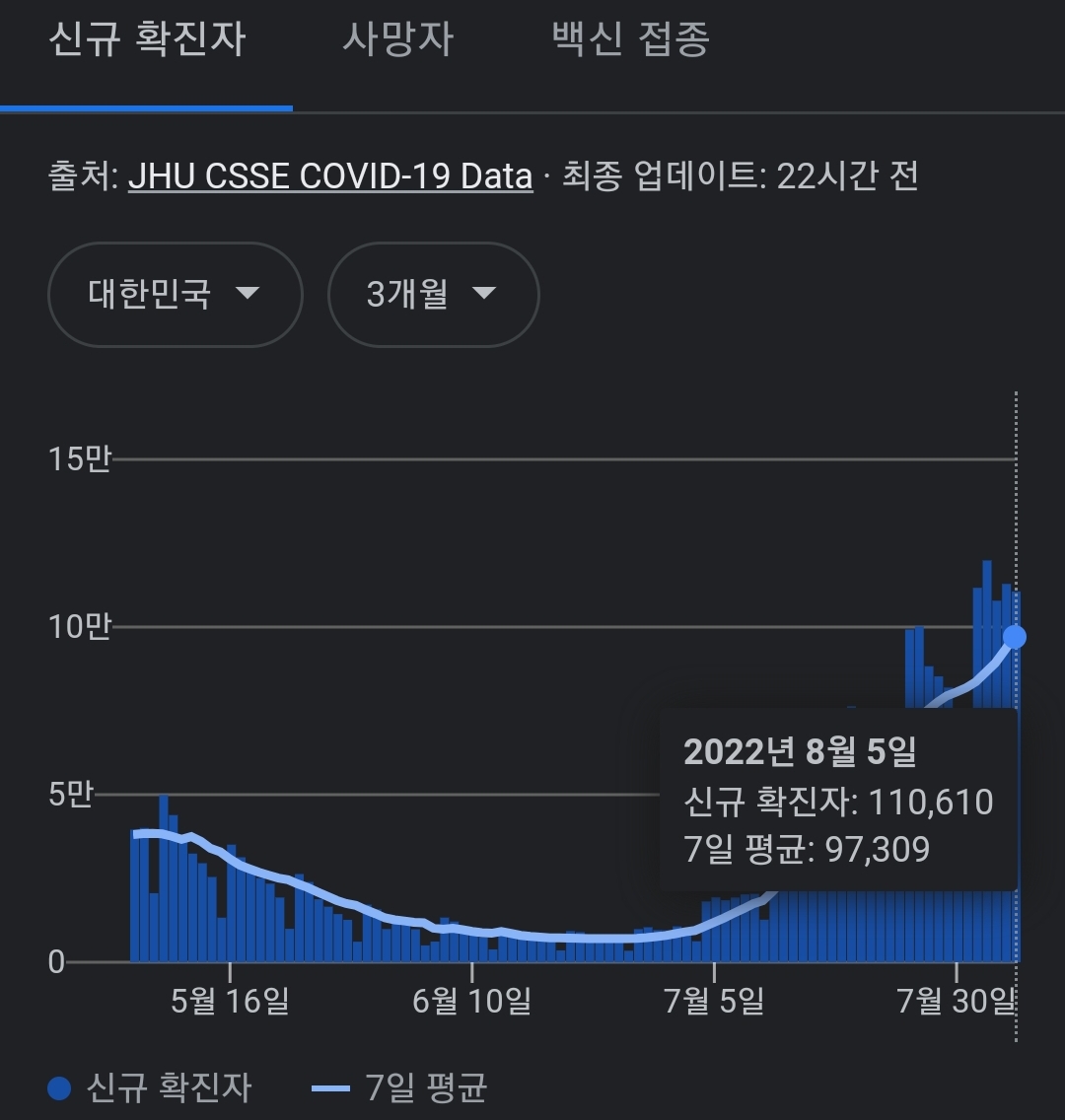 코로나19집계(2022.8.6. 0시기준) 확진 +11만, 사망 +45명, 위중중병상가동률 35%, 재택치료 57만(집중관리 3.6천) 본문