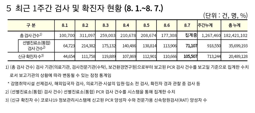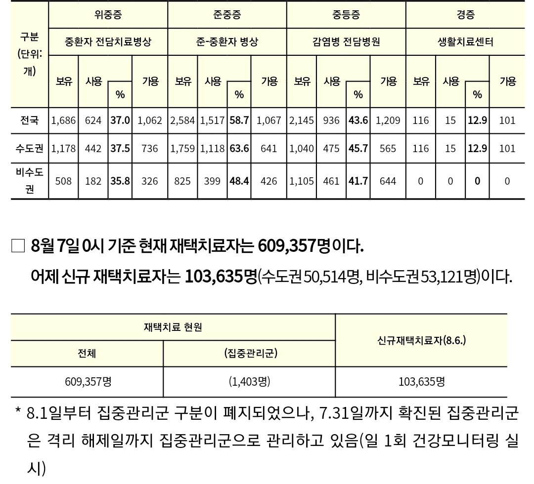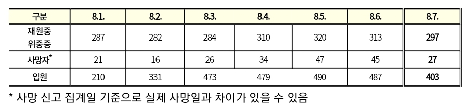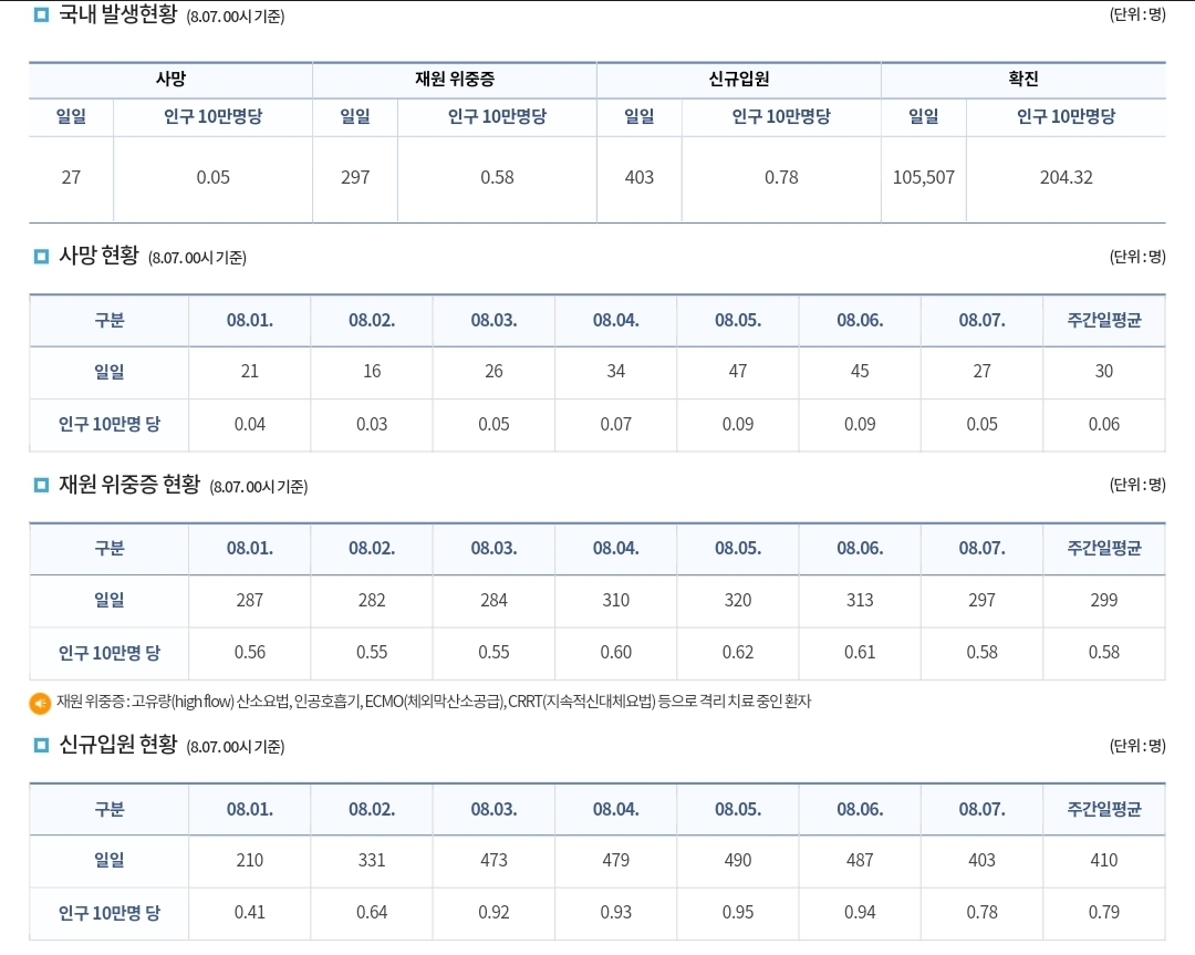 코로나19집계(2022.8.7. 0시기준): 확진 +11만, 사망 +27명, 위중증병상가동률 37%, 재택치료 61만(집중관리 1.4천) 본문