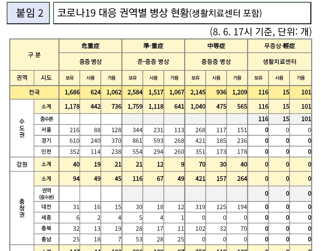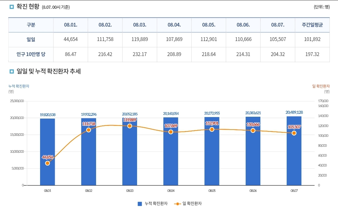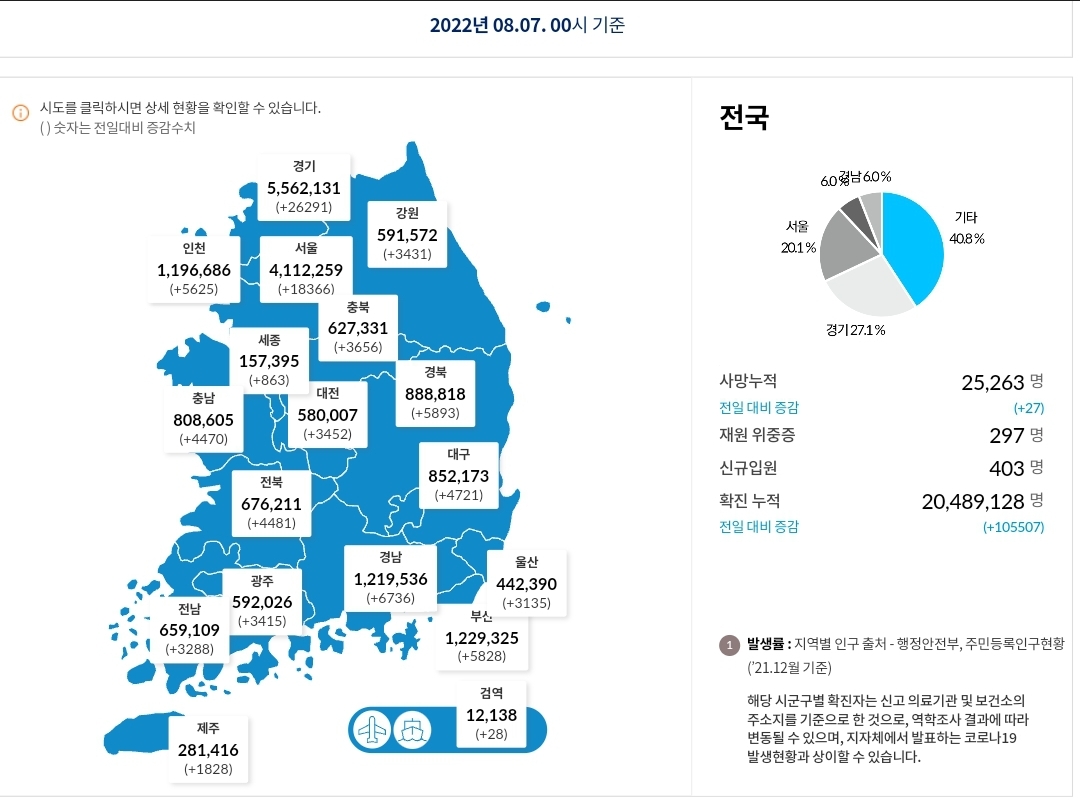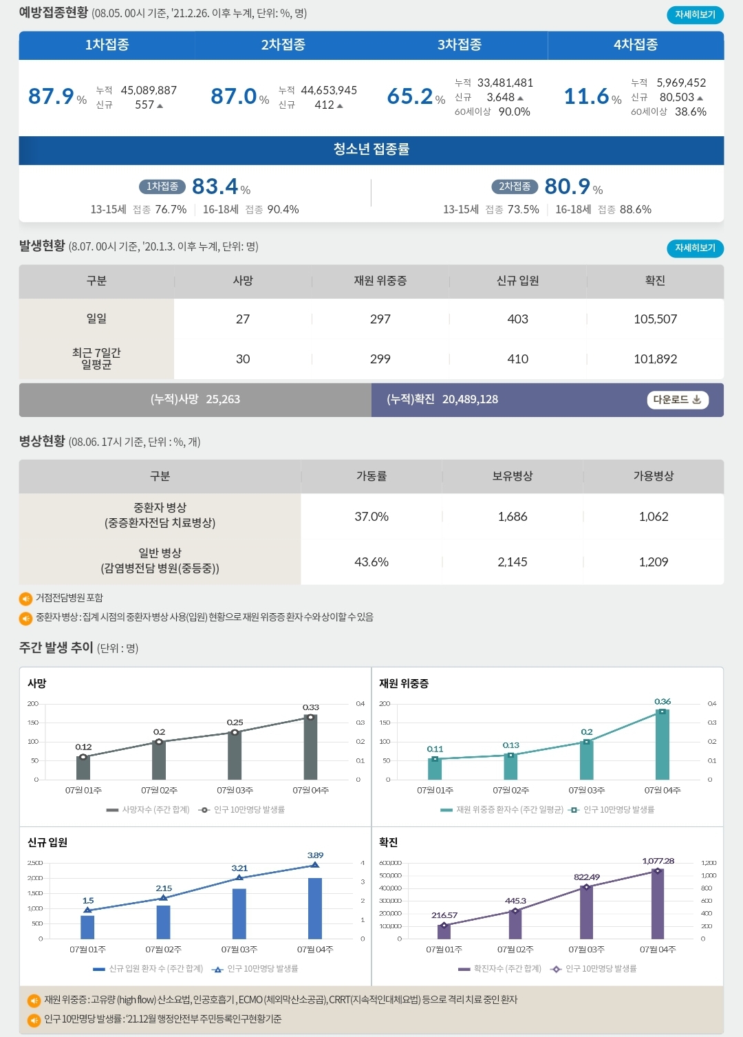 코로나19집계(2022.8.7. 0시기준): 확진 +11만, 사망 +27명, 위중증병상가동률 37%, 재택치료 61만(집중관리 1.4천) 본문
