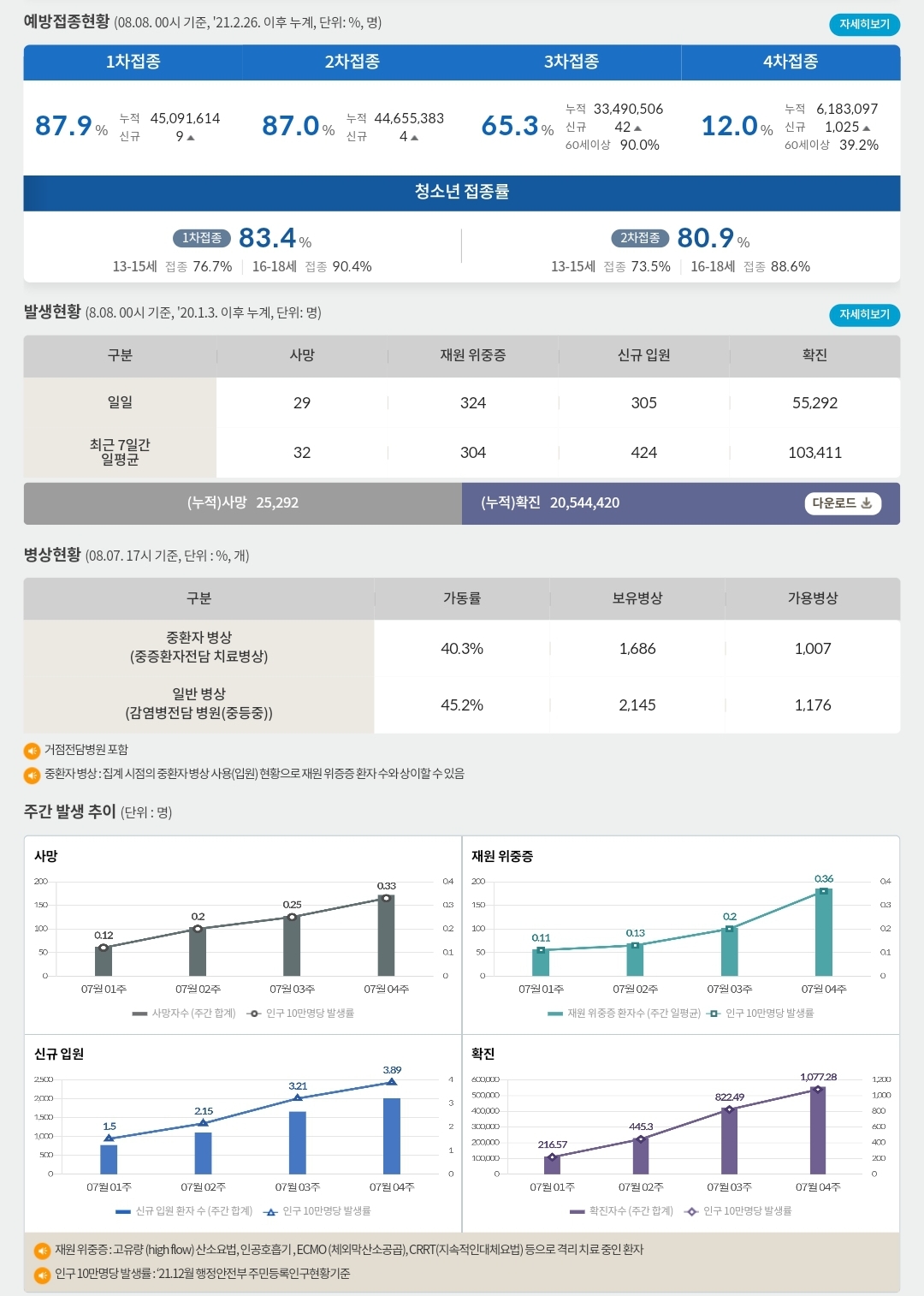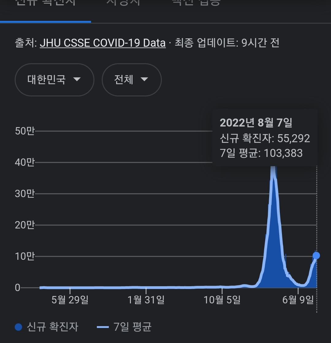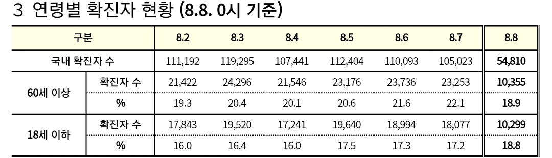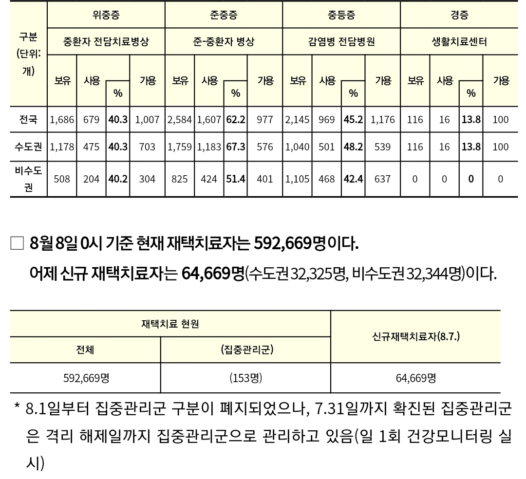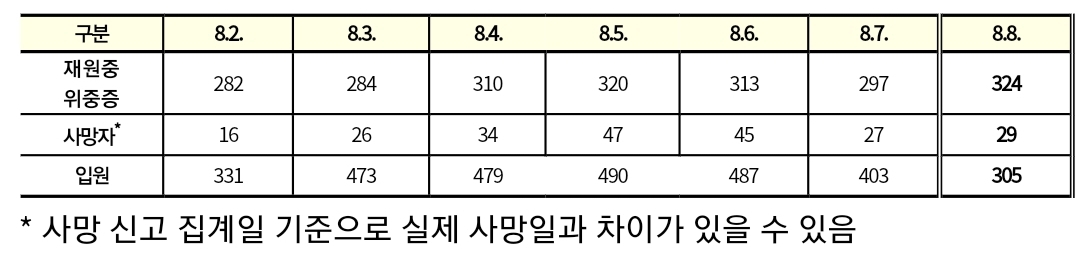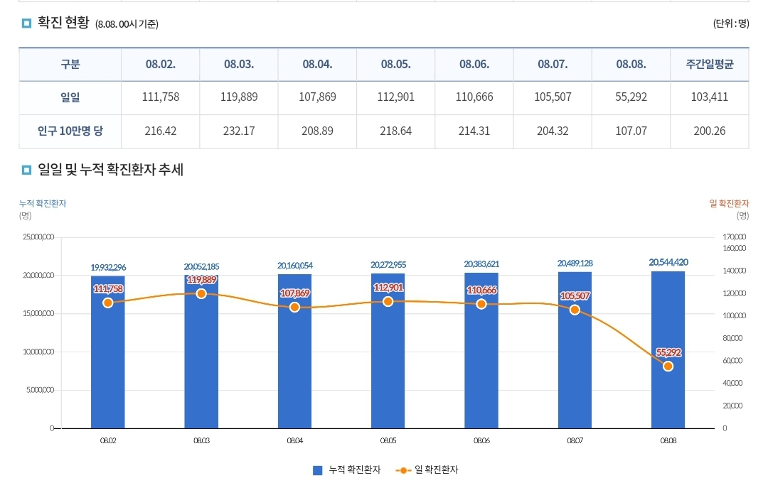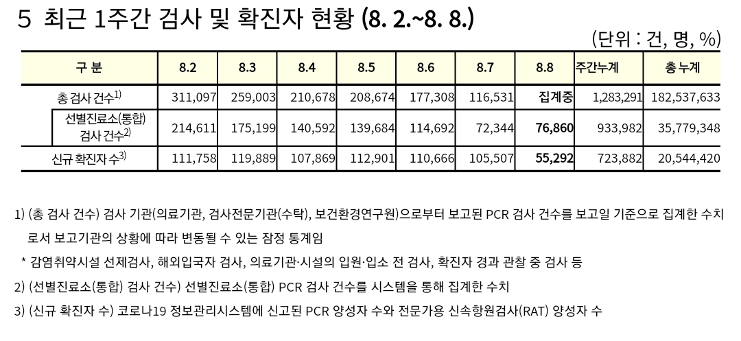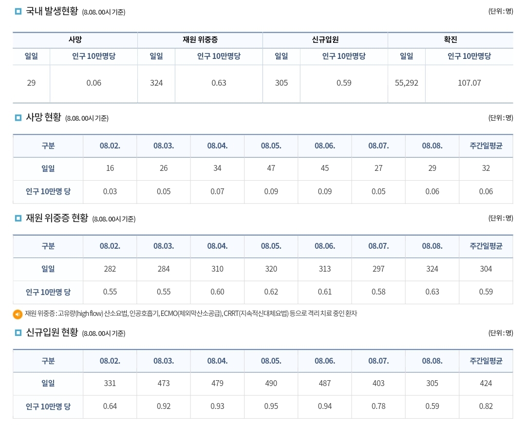 코로나19집계(2022.8.8. 0시기준) 확진 +5.5만, 사망 +29명, 위중증병상가동률 40%, 재택치료 60만 본문