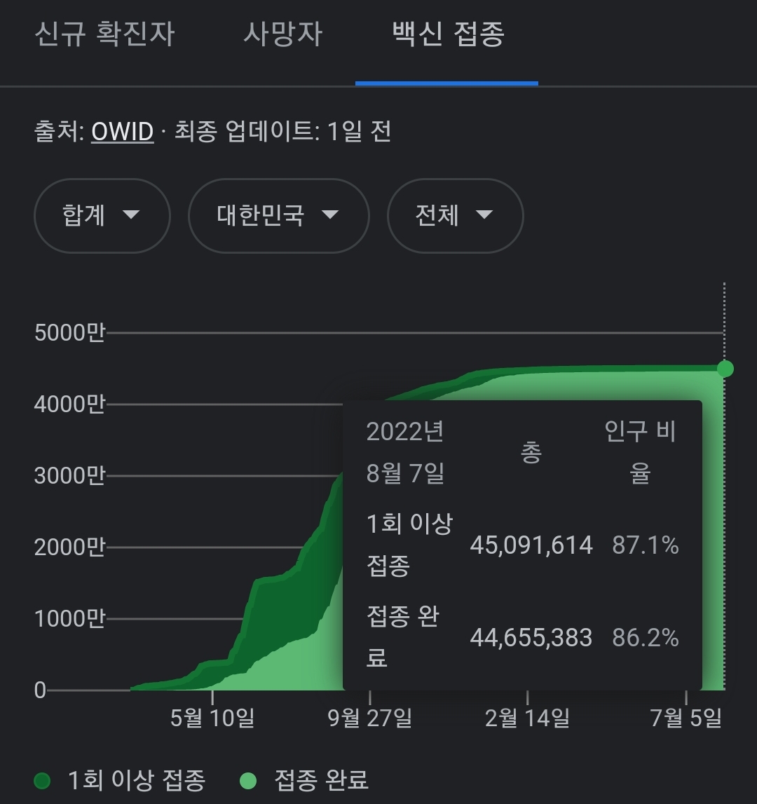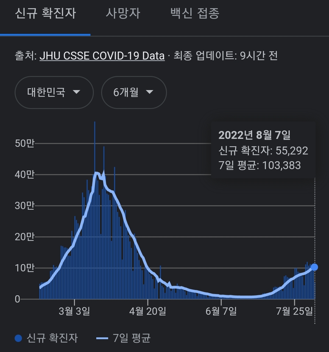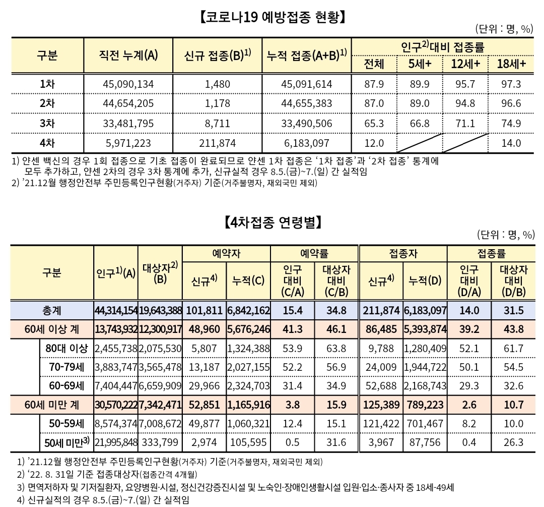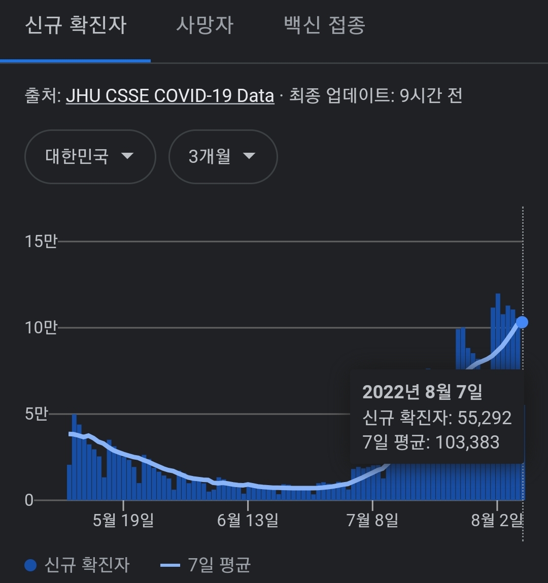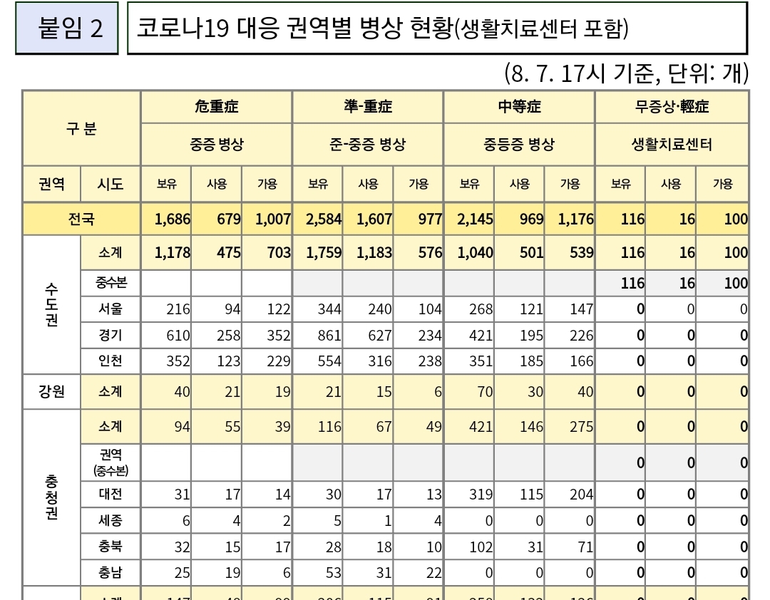 코로나19집계(2022.8.8. 0시기준) 확진 +5.5만, 사망 +29명, 위중증병상가동률 40%, 재택치료 60만 본문