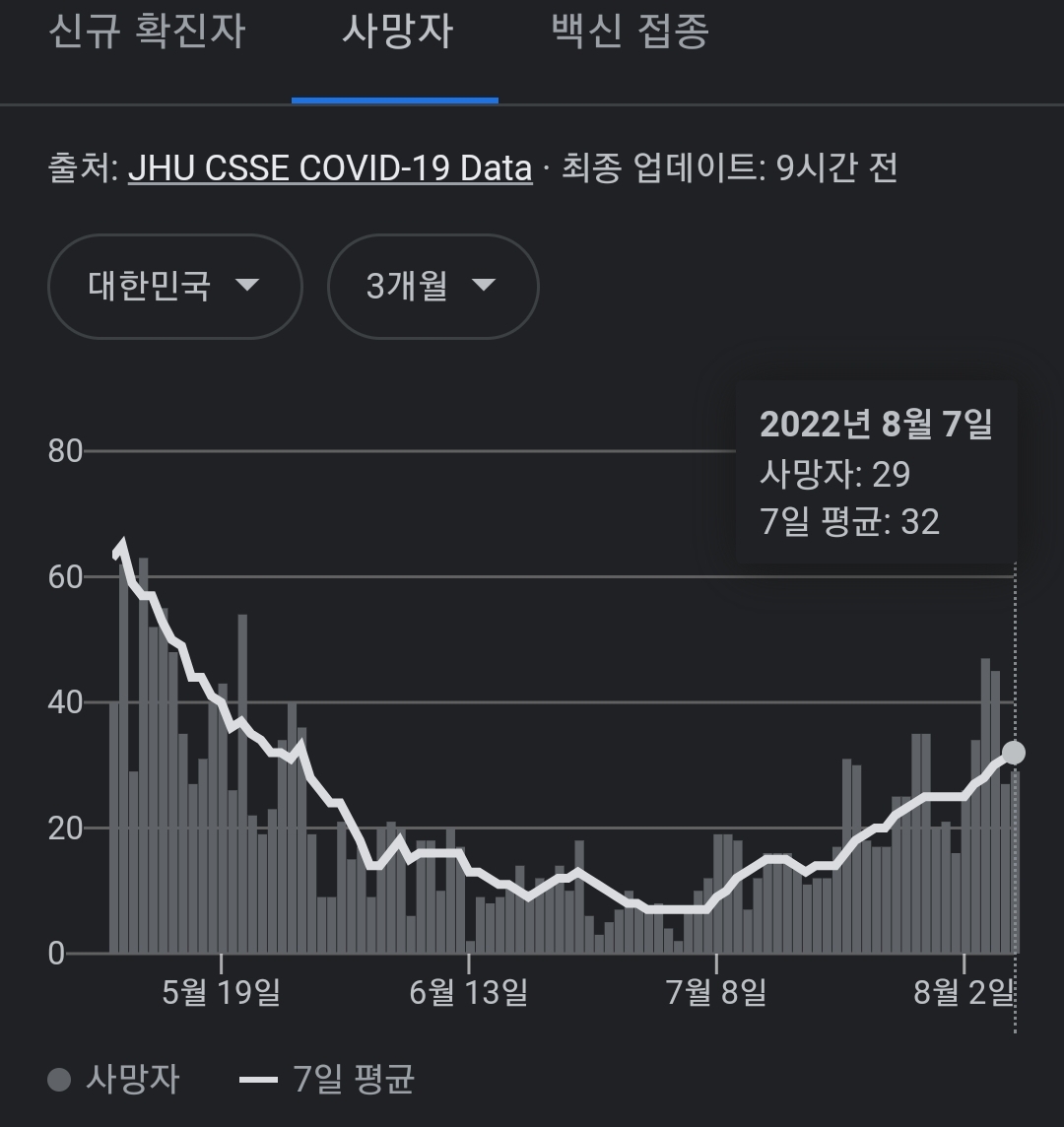 3개월 전 5월 초순과 비교하면 일일신규확진자가 2배 이상이지만 일일신규사망자는 2/3정도입니다.