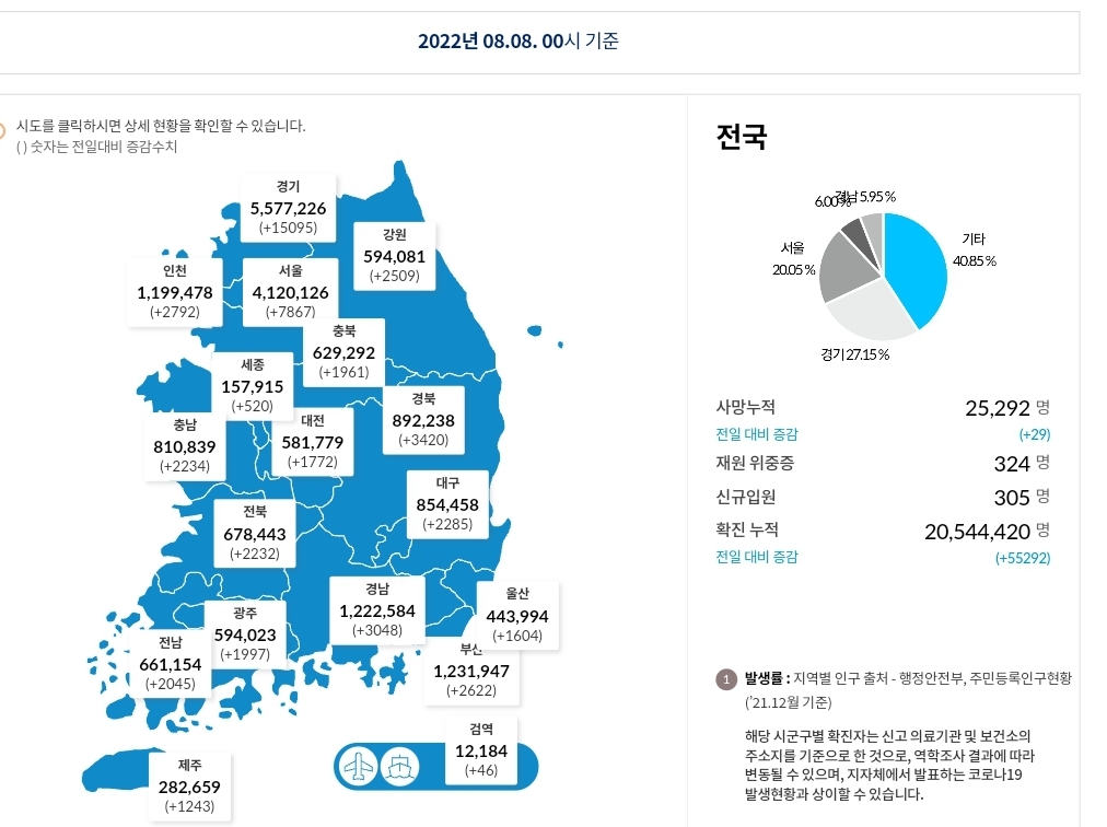 코로나19집계(2022.8.8. 0시기준) 확진 +5.5만, 사망 +29명, 위중증병상가동률 40%, 재택치료 60만 본문
