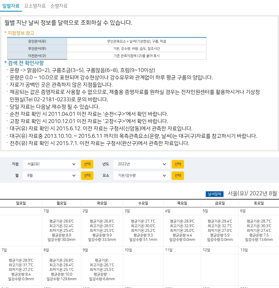 과거관측 - 일별자료 - 기상청 날씨누리